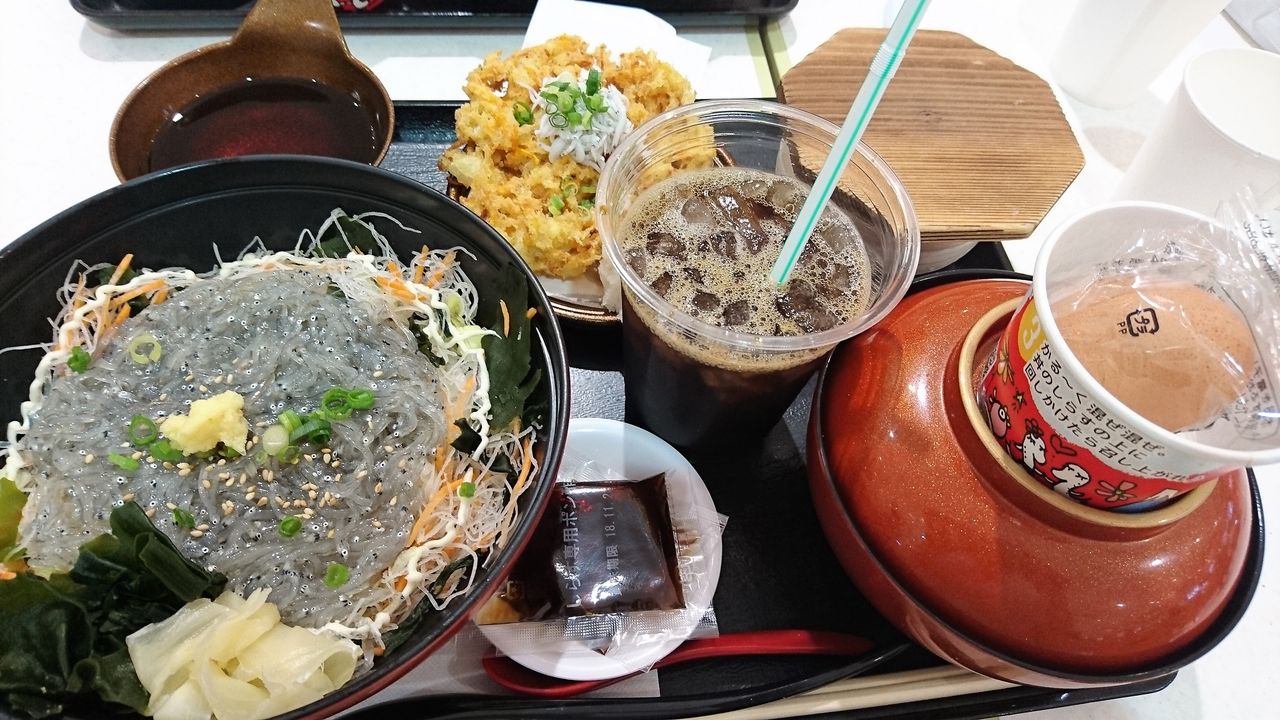 あおさの味噌汁に生しらす丼、温泉卵、