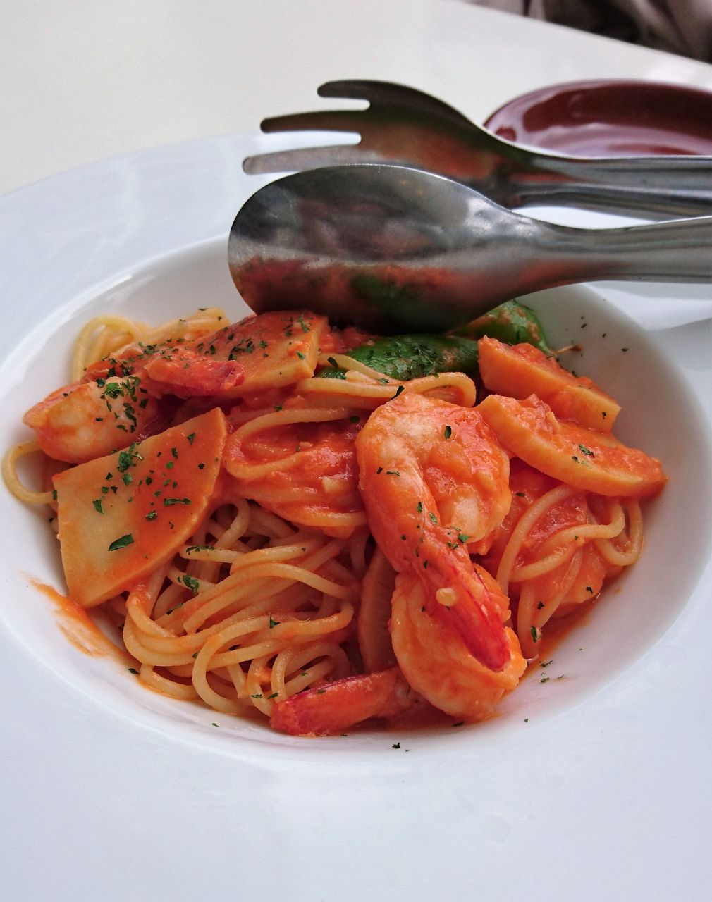 我々は海老と春野菜のトマトクリームソースパスタをチョイス。