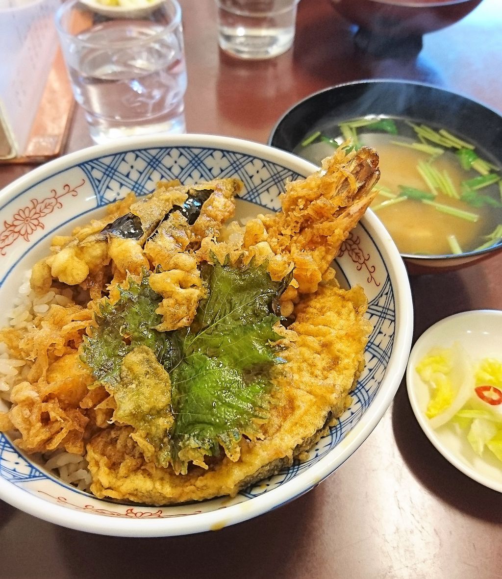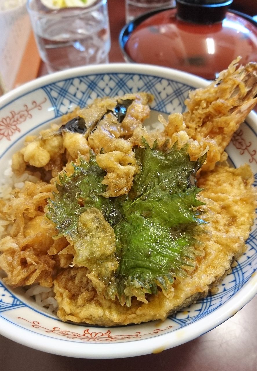 さっと丼つゆにくぐらせた海老、茄子、カボチャ、大葉の天ぷらがご飯の上に乗ってます。