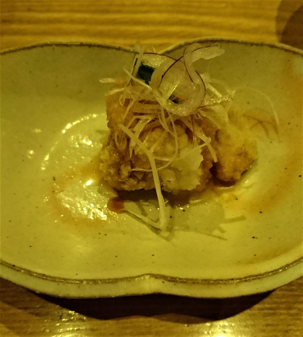 ざっくりいうと鰹の竜田揚げに大根おろしと玉ねぎスライスとポン酢がかかったものなんだけど