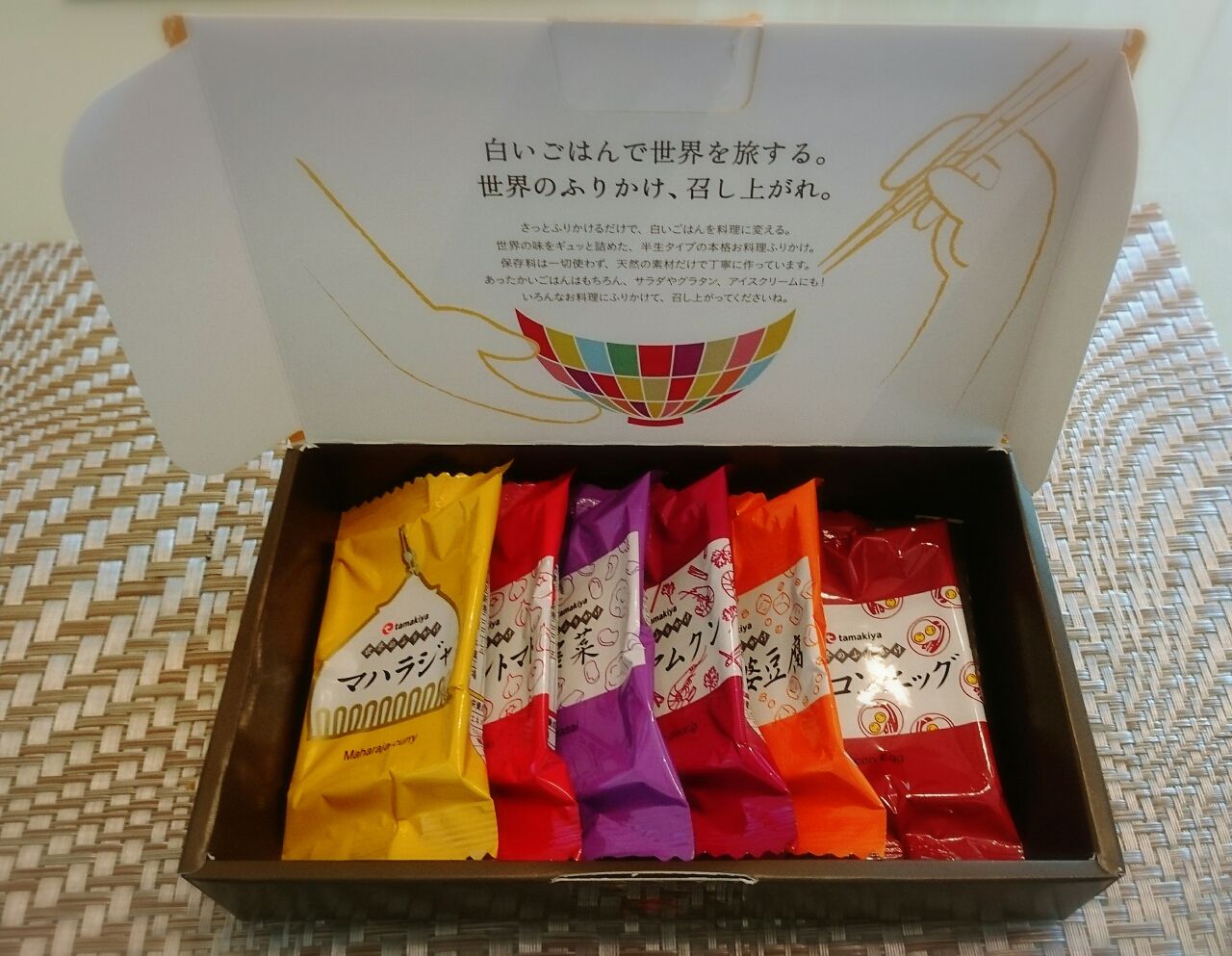 マハラジャ(カレー)からイタリアントマト、搾菜、トムヤムクンに麻婆豆腐にベーコンエッグと世界各国のご飯がふりかけなっているの~。