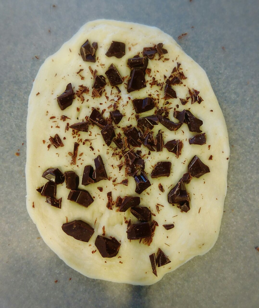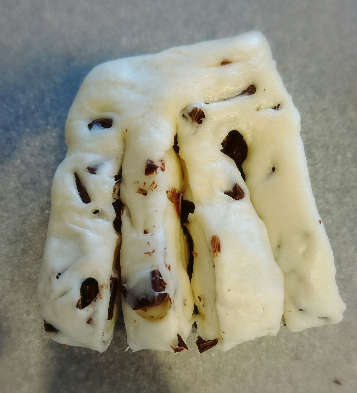 チョコは細かく切っておいて、一次発酵のあと9個に生地をわけて生地を伸ばしたところに