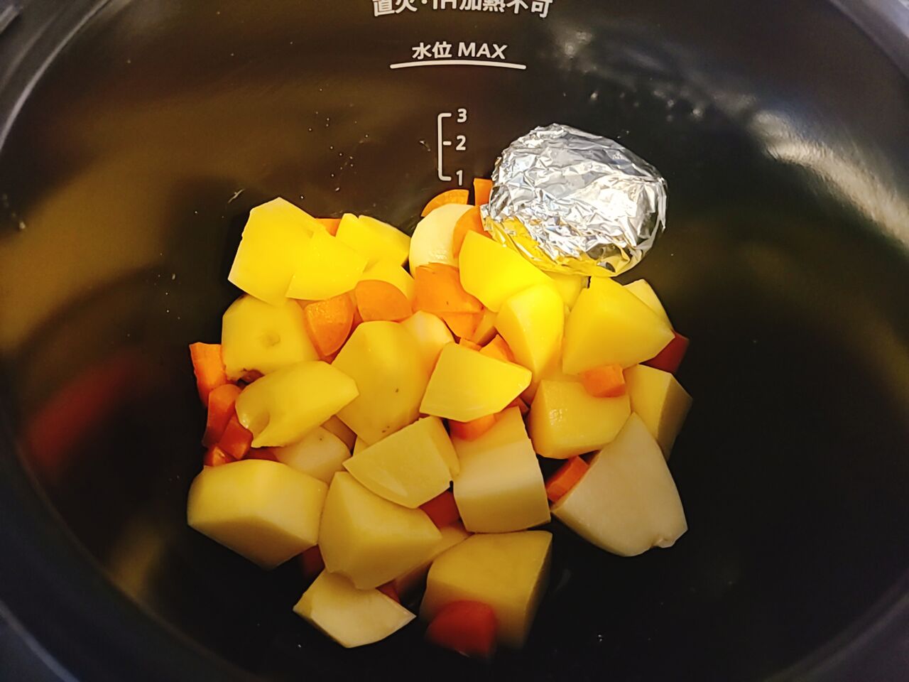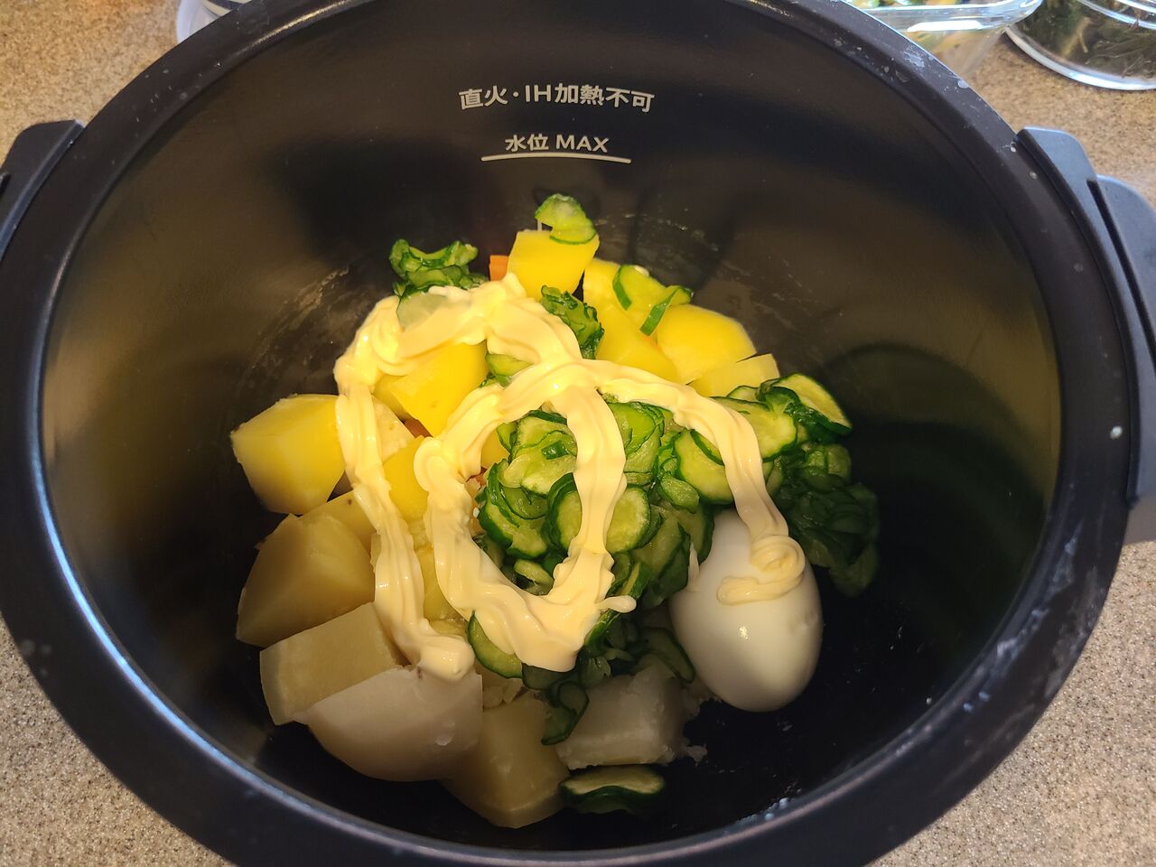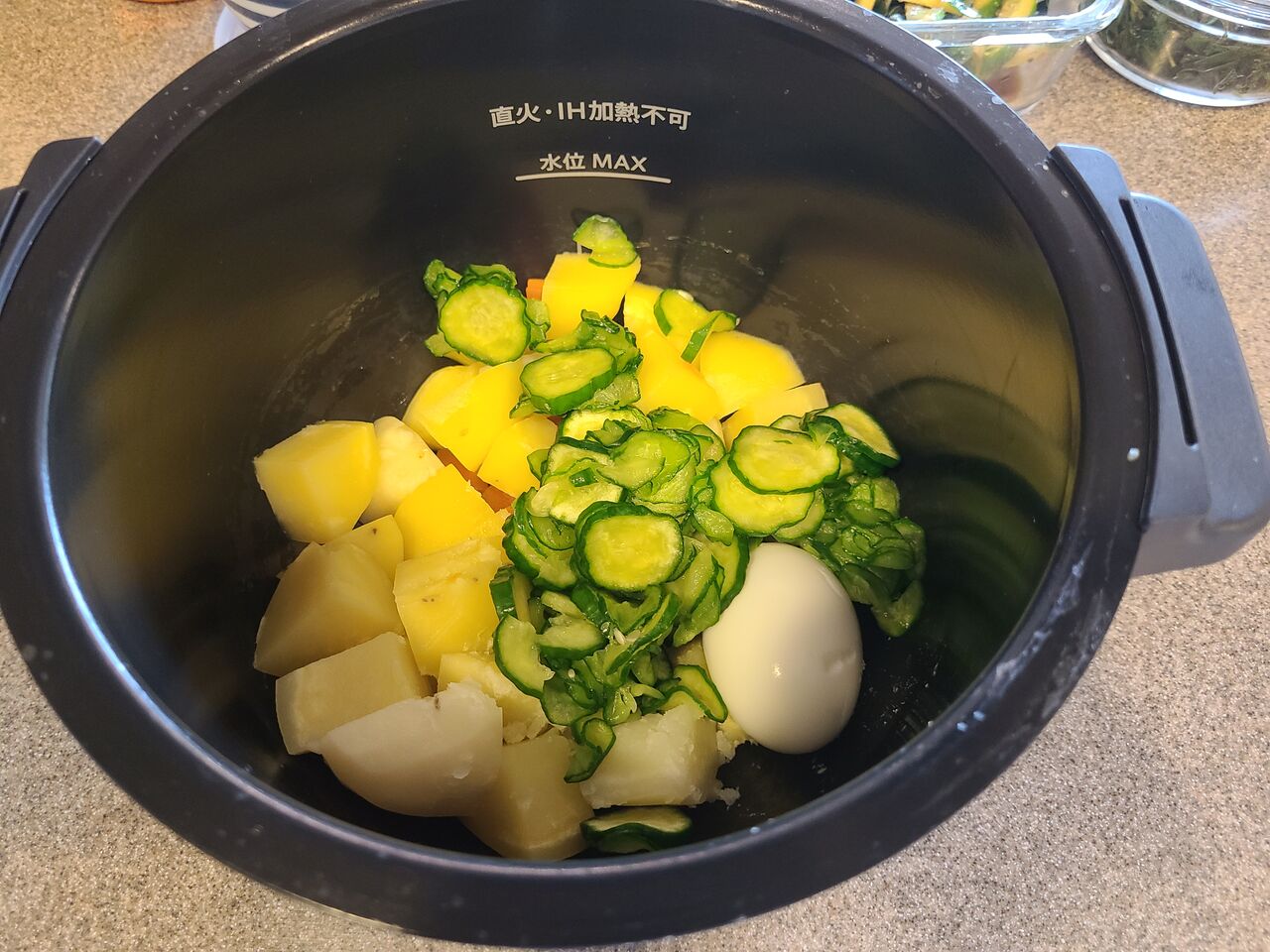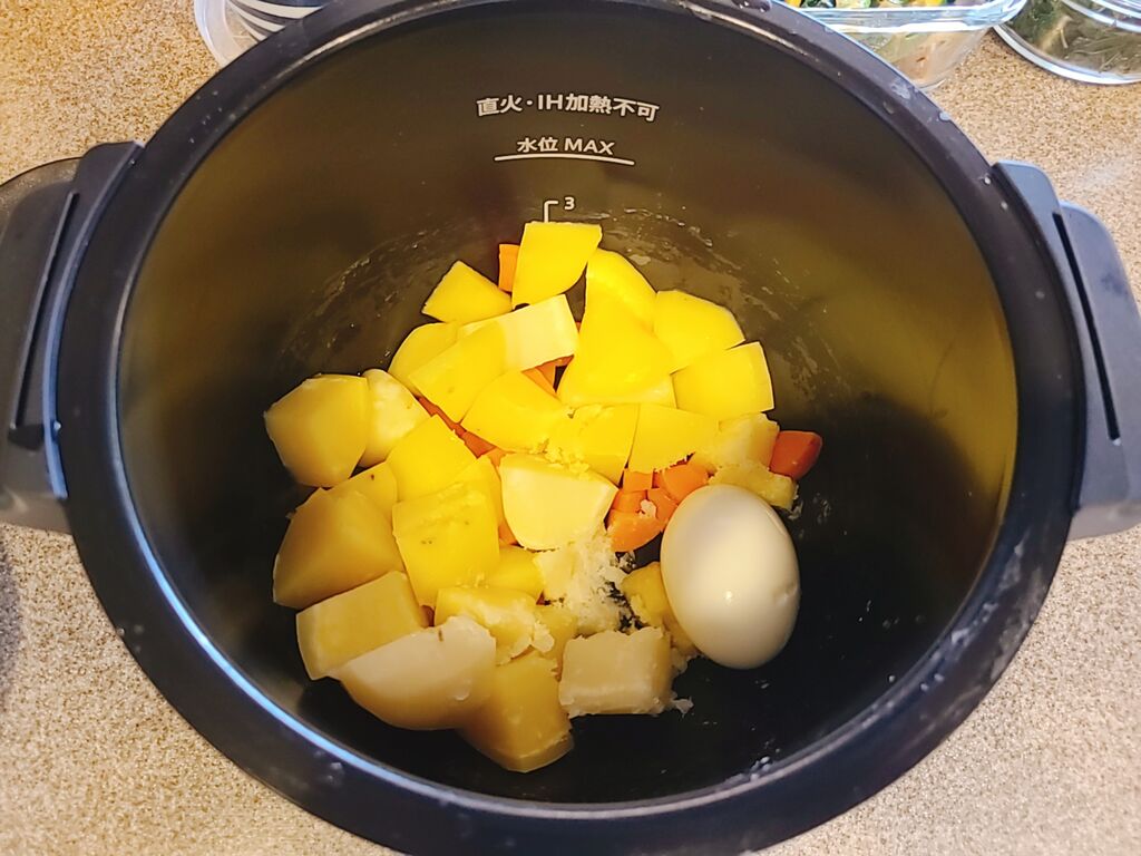 皮をむいたじゃがいもと人参をホットクックの鍋に入れて