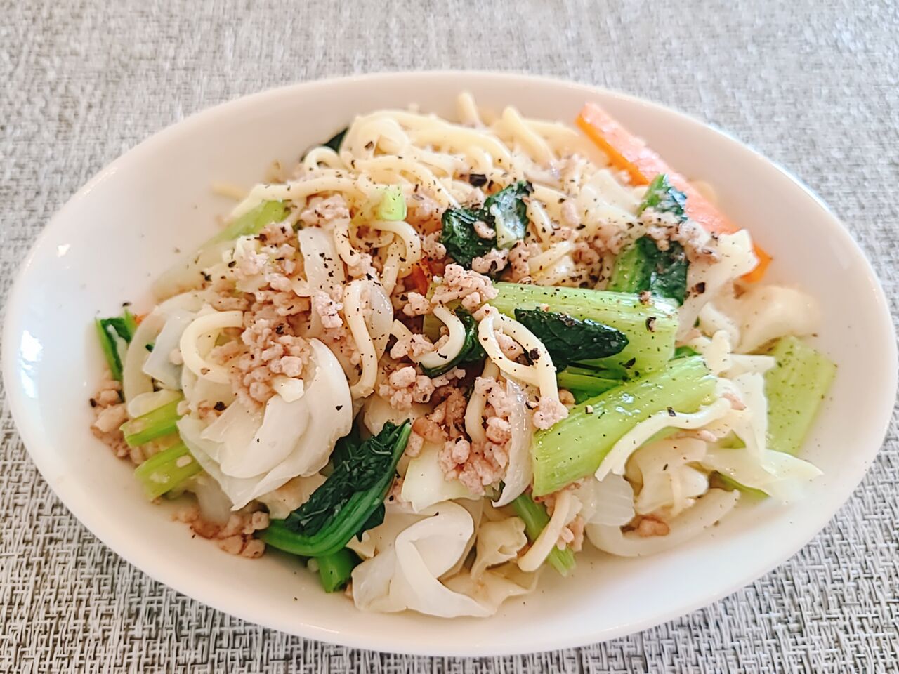 黒コショウと野菜たっぷりの塩焼きそばです。