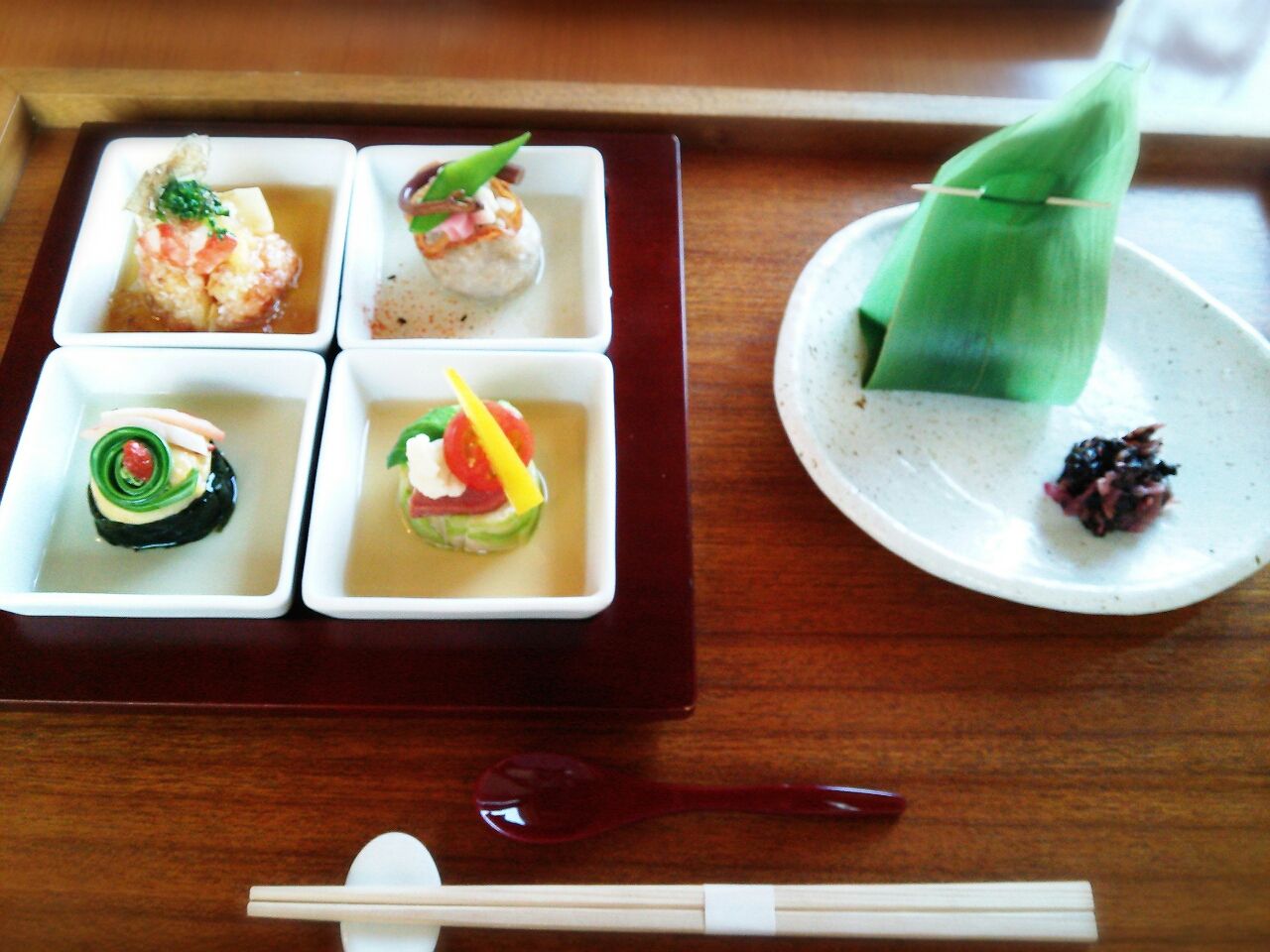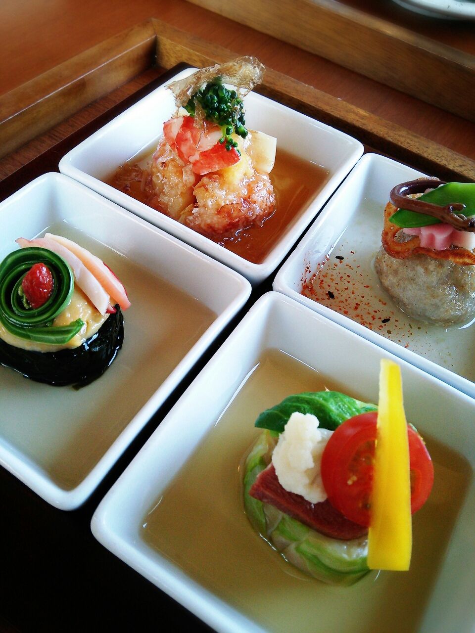前菜4種盛りは左上から時計回りで、筍と海老しんじょ。