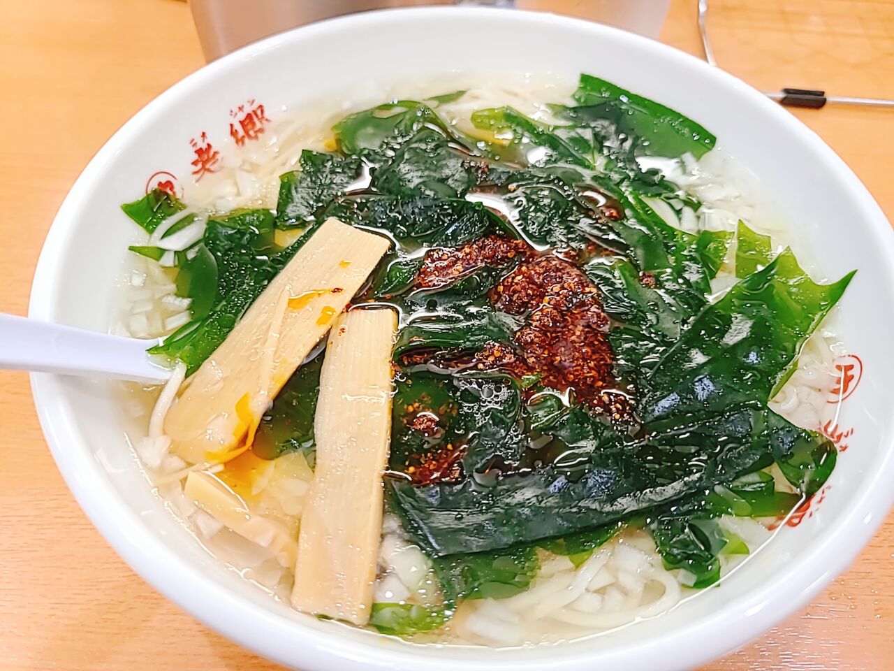 細い冷や麦のような麺に大量のワカメと玉ねぎのみじん切り、メンマ。