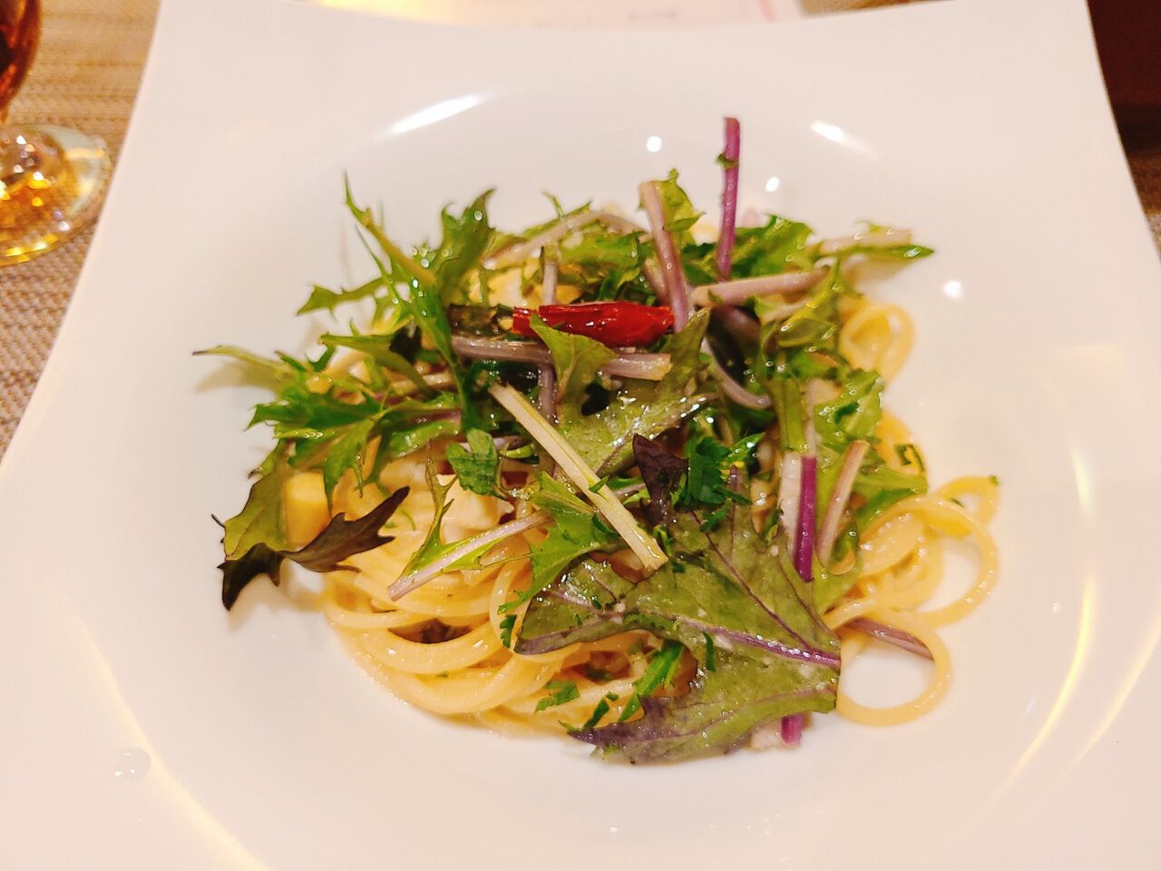 この日の本日のパスタは小柱と三浦産赤水菜のペペロンチーノでした。