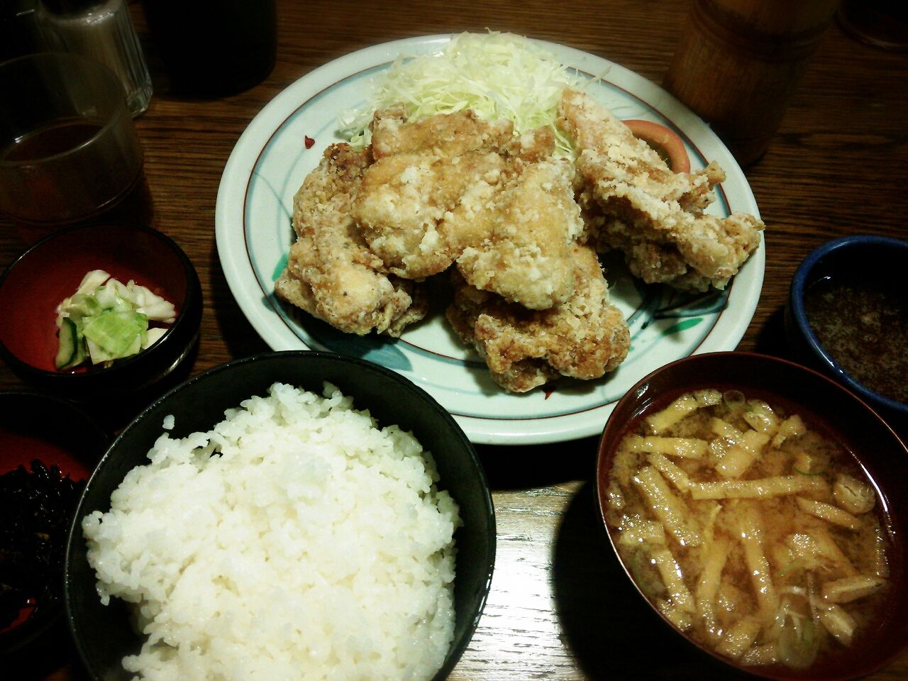 キャベツ、唐揚げ、ご飯、唐揚げ、味噌汁、ご飯、唐揚げ、漬物…で気付けば食べ終わってました。
