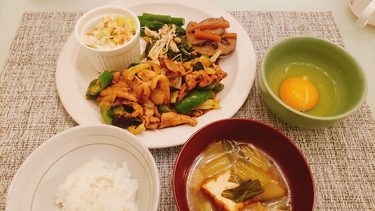 (ぐっさんのCM見てから回鍋肉は生卵につけて食べる派。付け合わせは全部作り置き)