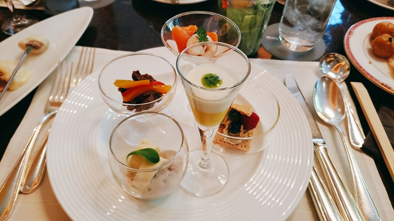 このクラッカーの上にクリームみたいに絞られてるフォアグラ(写真で言うと3時の場所にあるやつ)はくっそ美味しくておかわりしました。