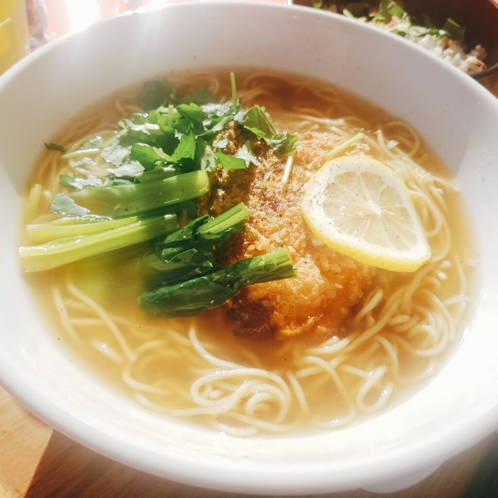 鯖出汁が効いたスープに鯖の竜田揚げが乗ってる。