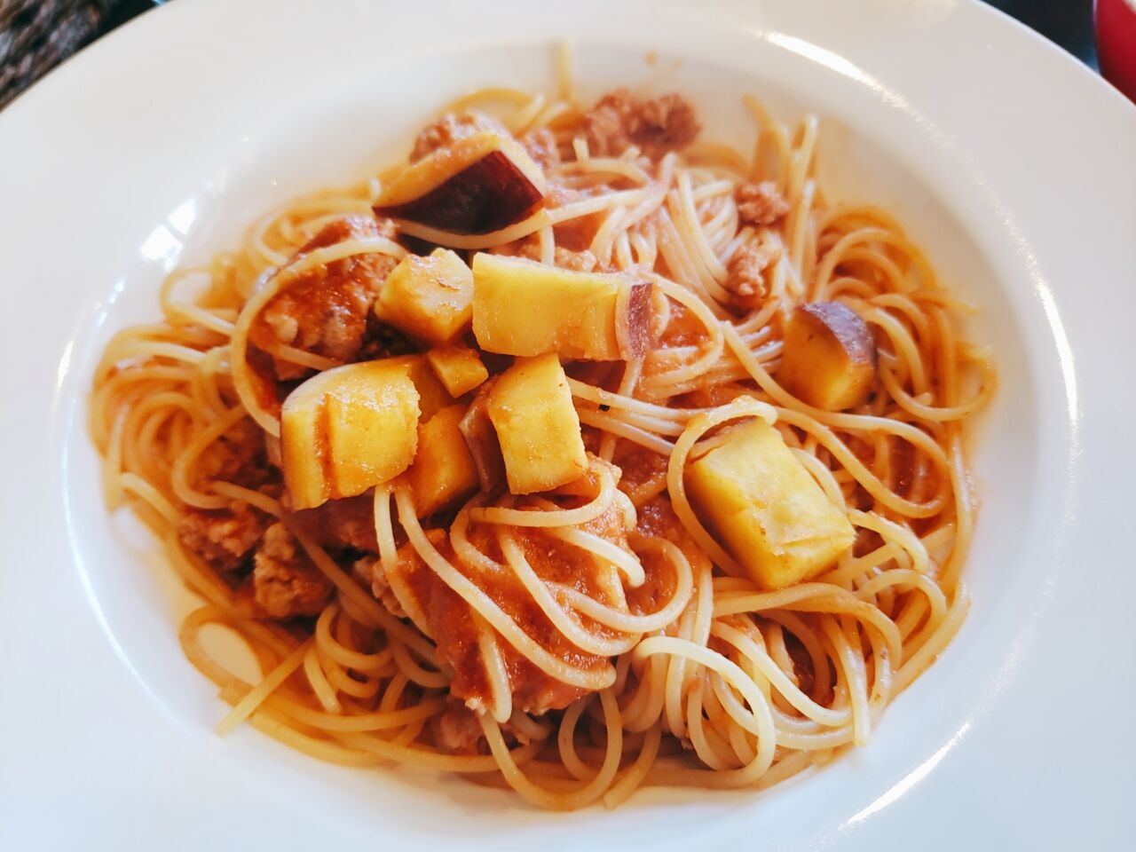 私が豚ひき肉とさつまいものトマトソースパスタ。