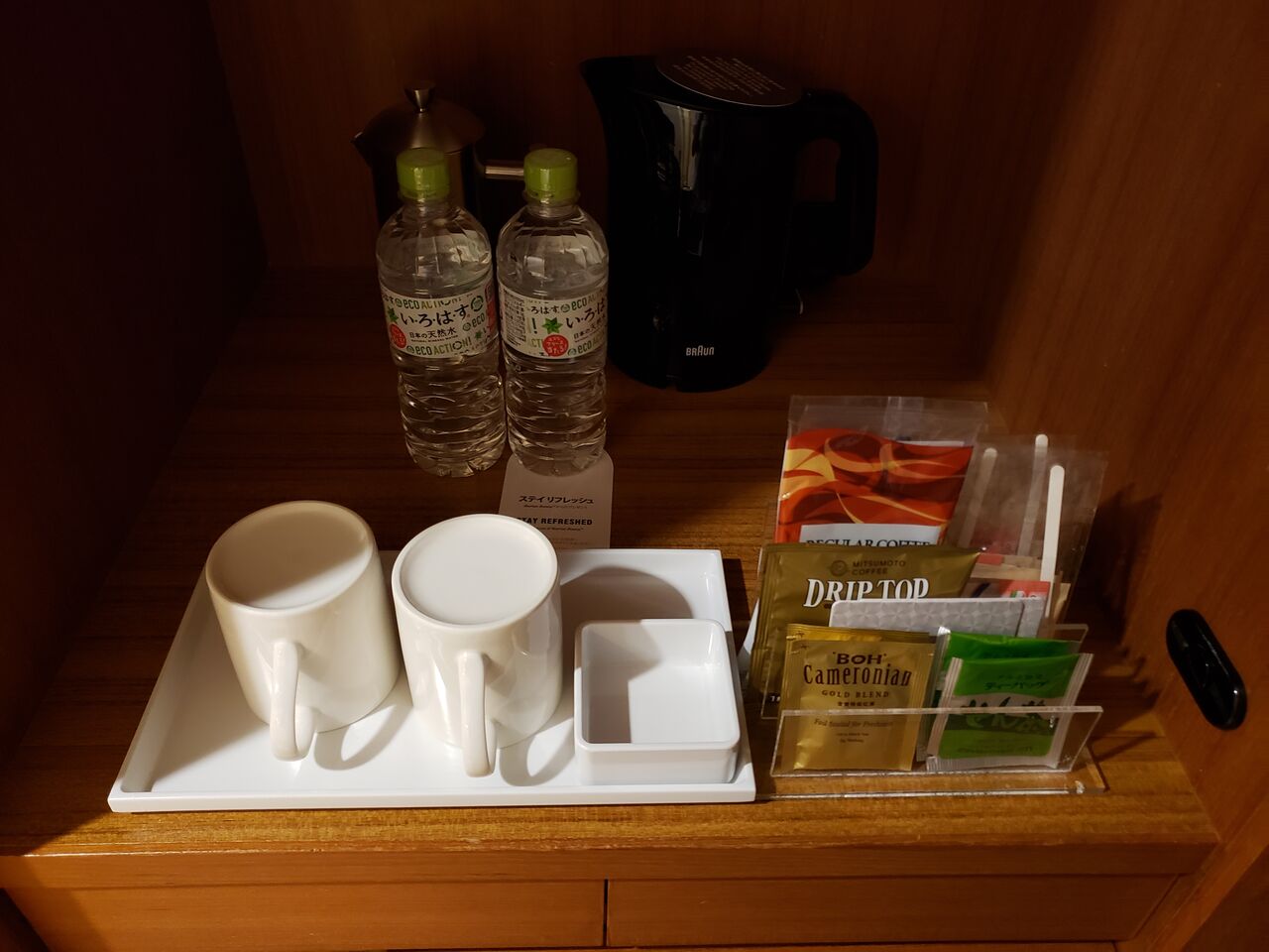 部屋にはお水とコーヒー、紅茶も。