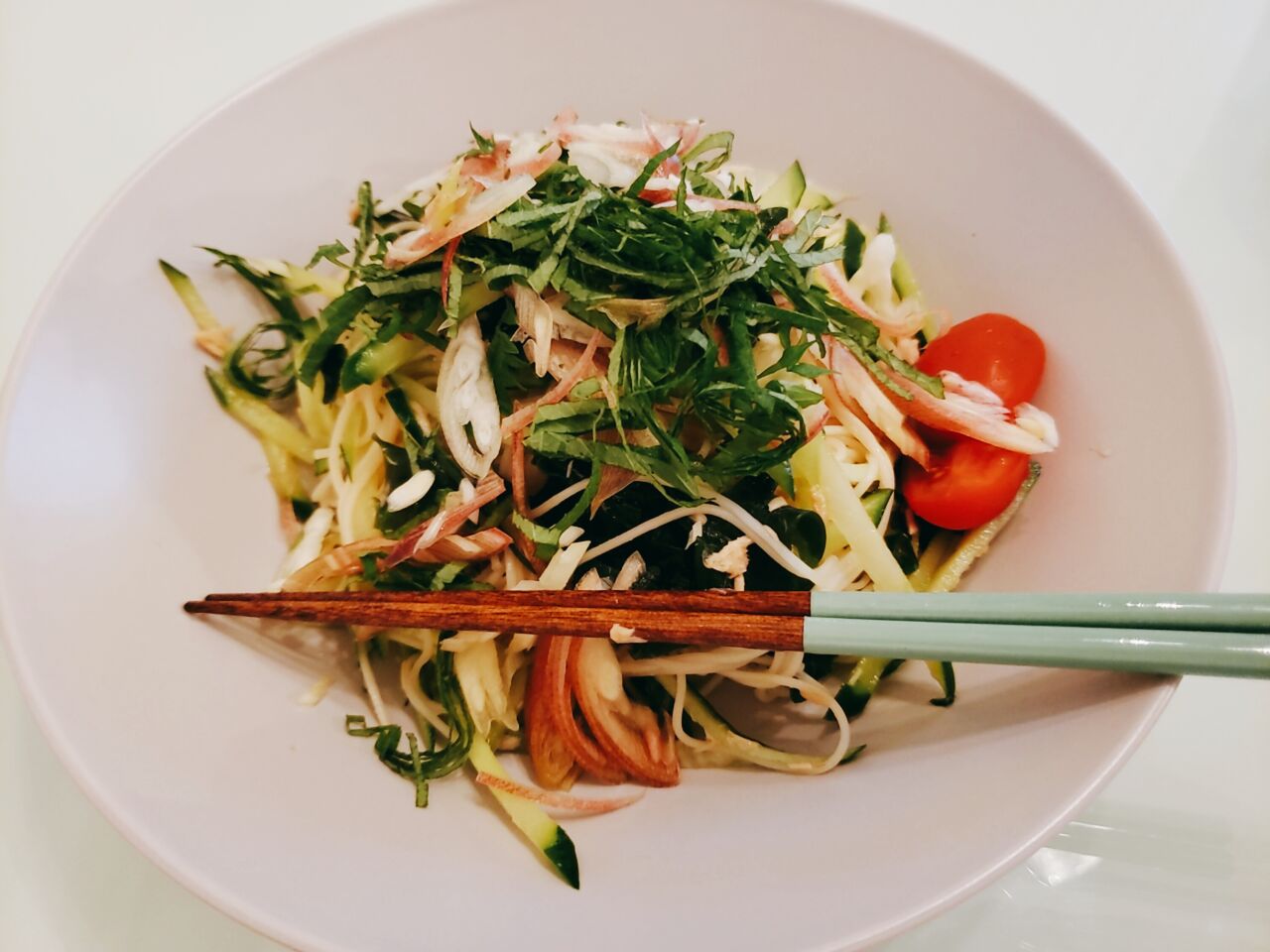 ①…そうめんの上にキュウリ、みょうが、紫蘇の千切りが乗ってる。
