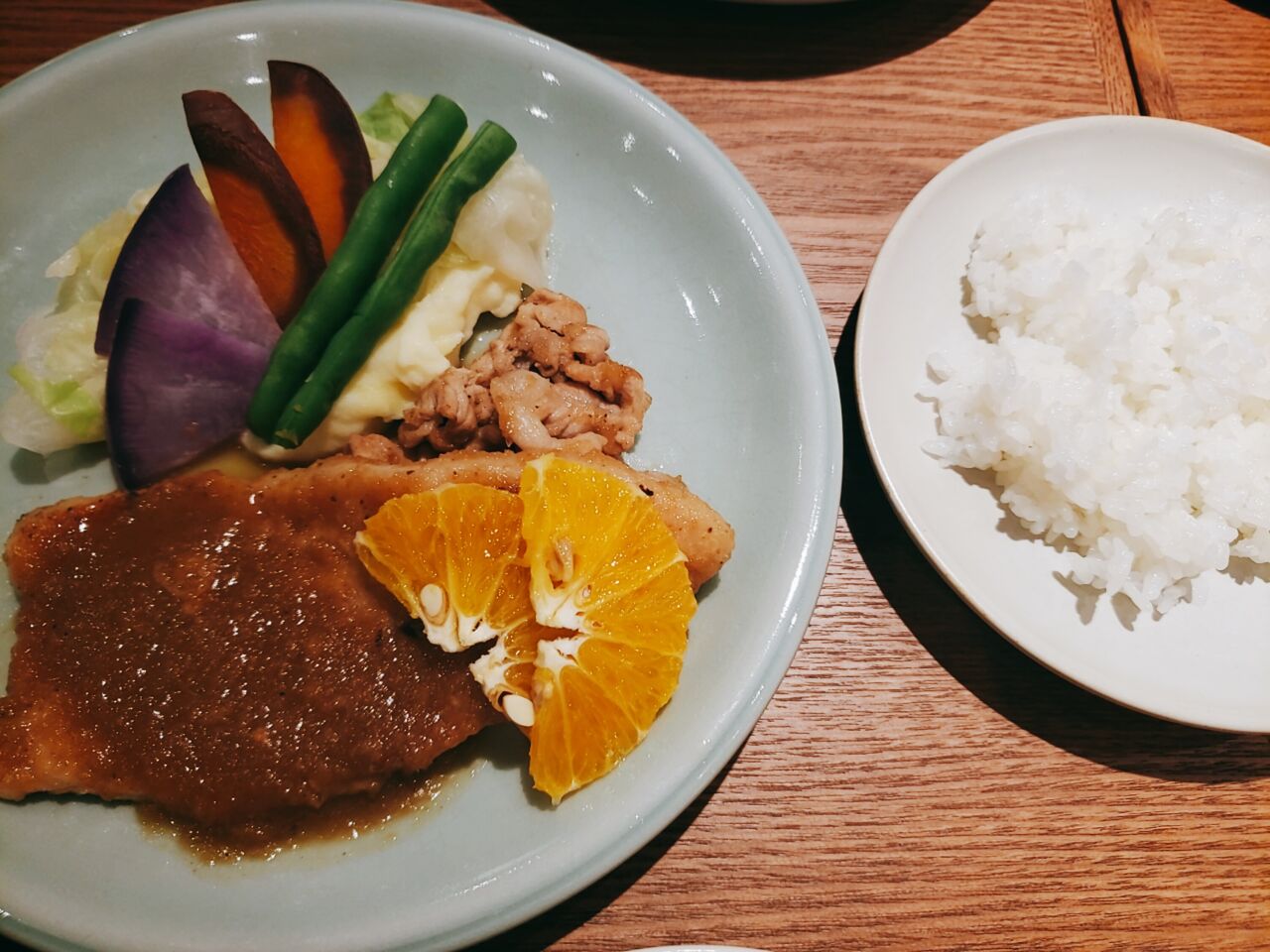 お野菜には味はついておらず、多分生姜焼きのタレを付けて食べる感じなんだろうけど