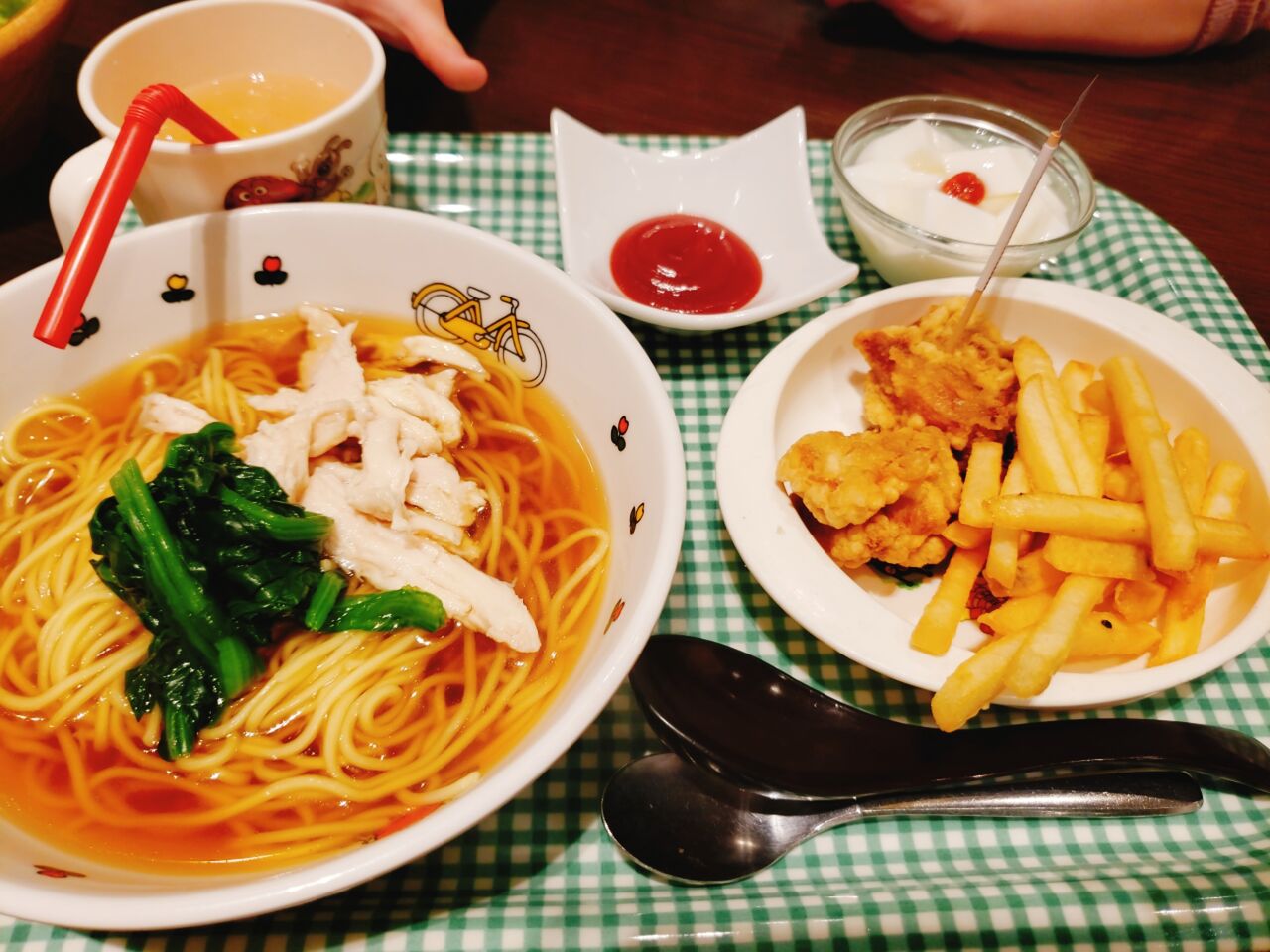 ラーメンに唐揚げ、ポテト、リンゴジュース、杏仁豆腐。