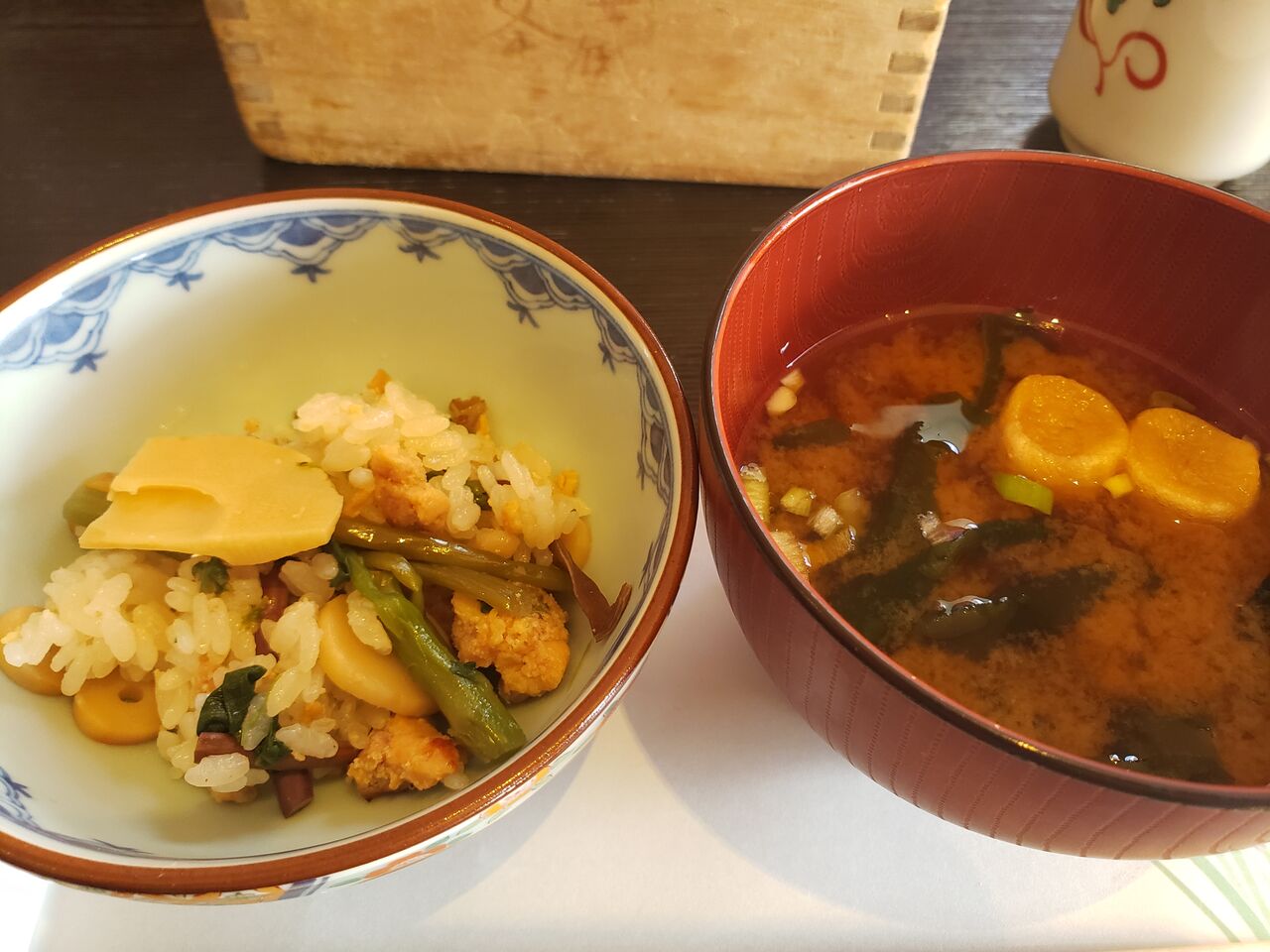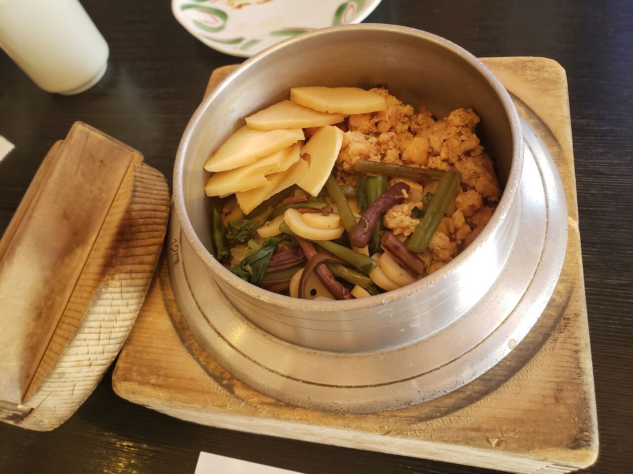 タケノコと山菜がシャキシャキしててそぼろは少し甘くて