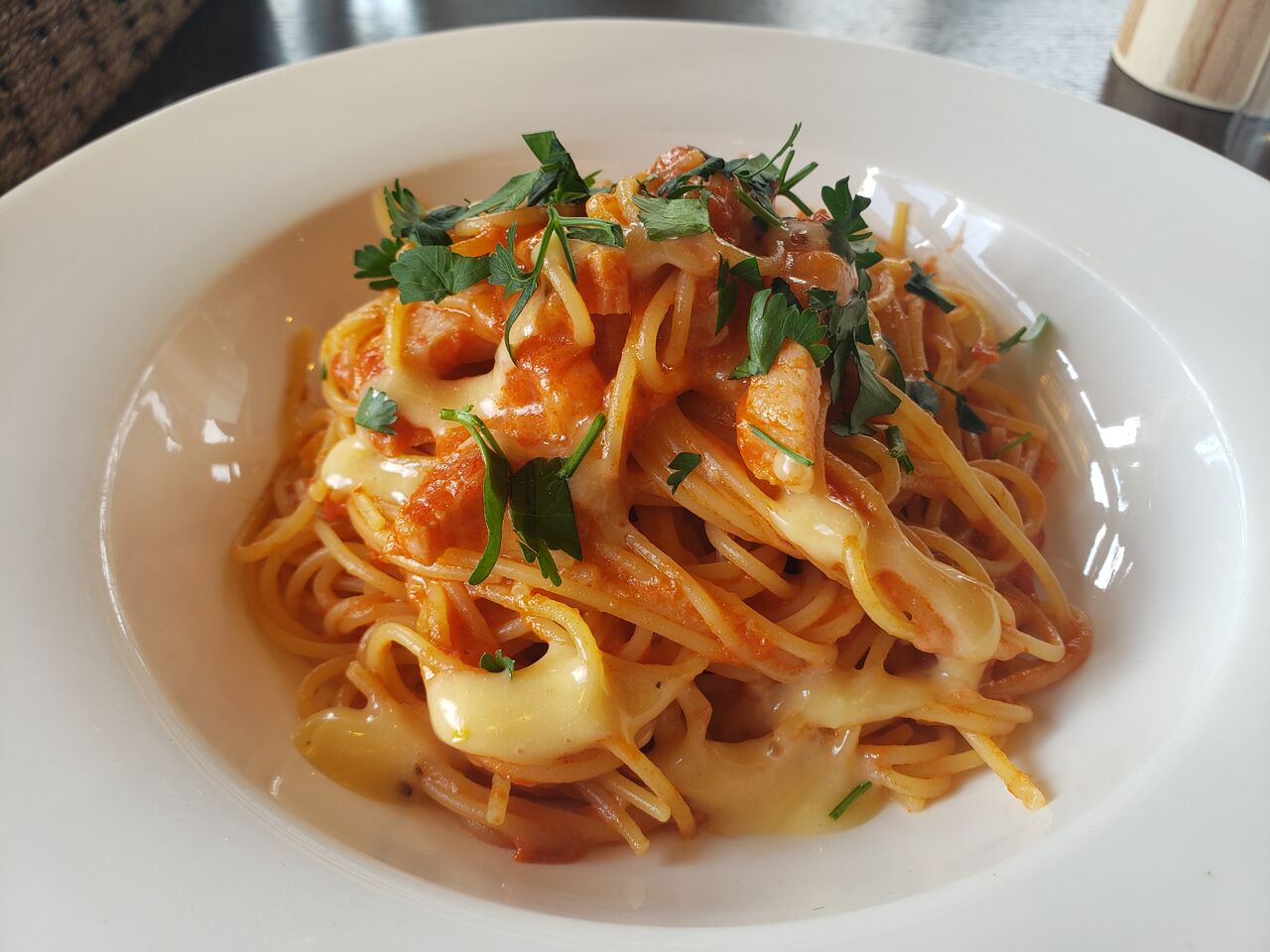 パスタはAセットのベーコンとチーズのトマトスパゲッティ。