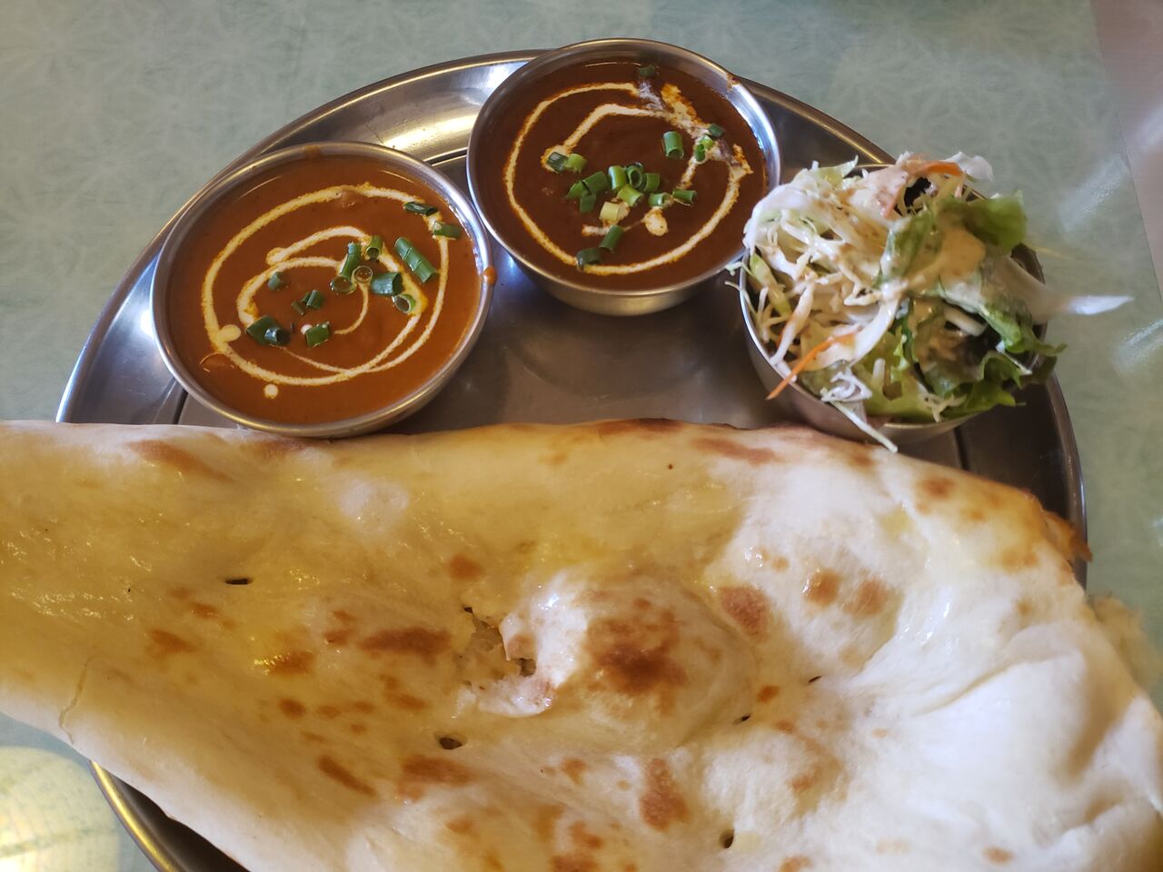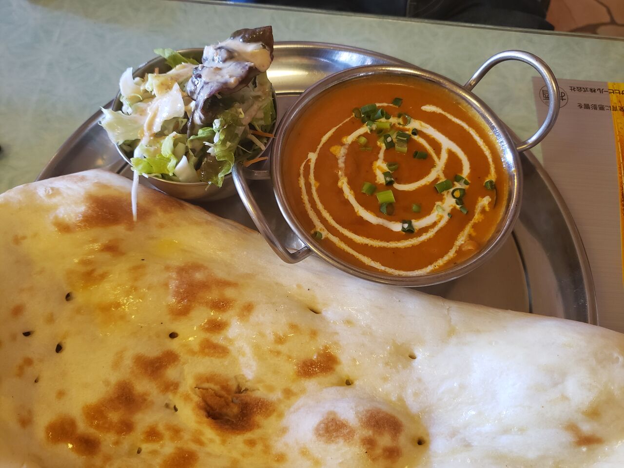 ごはん、ナン、サラダ、謎のデザート、ラッシー付き。