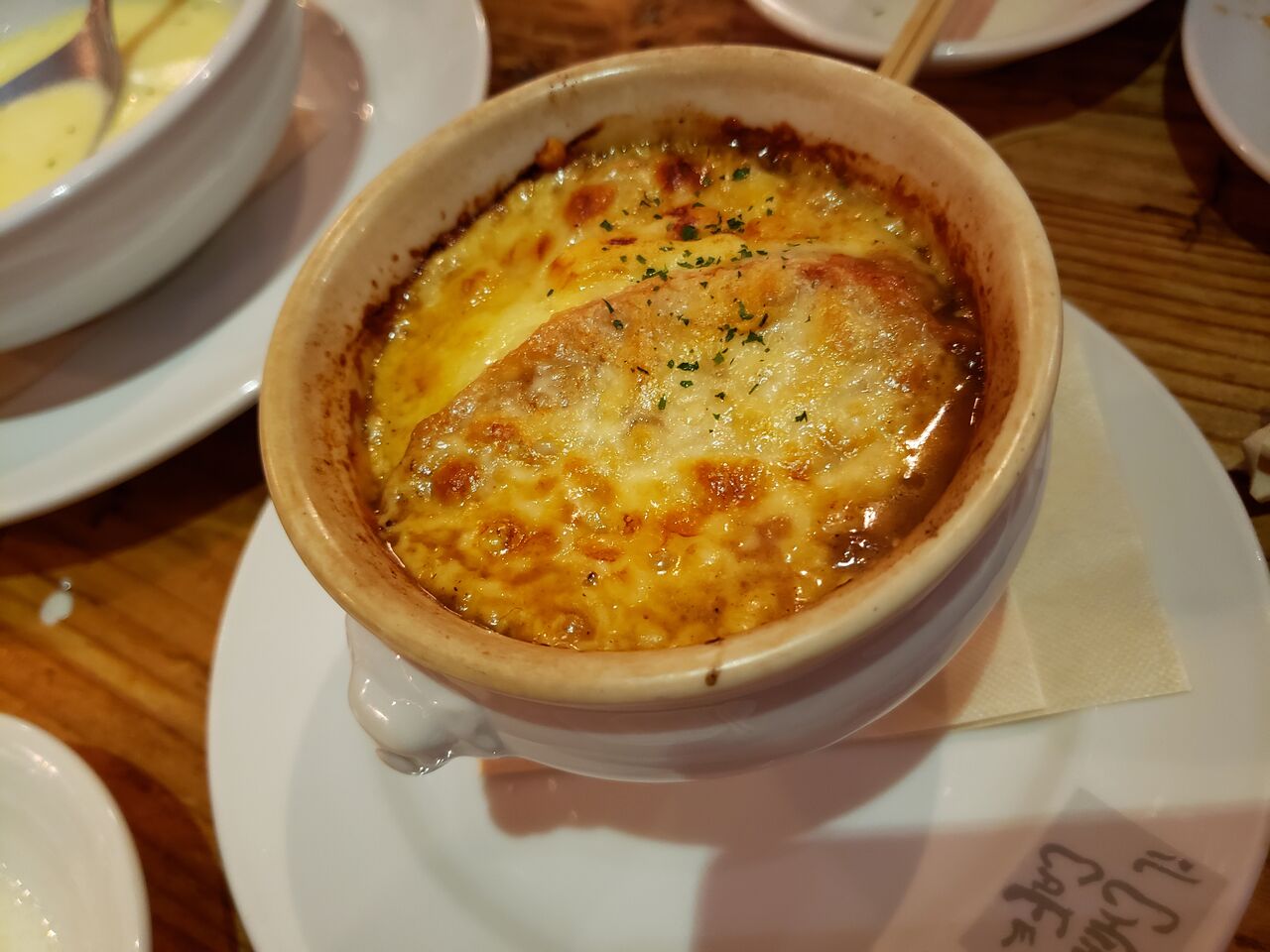 それからメニュー頼んだ時に体が冷えてたから欲したオニオングラタンスープ。