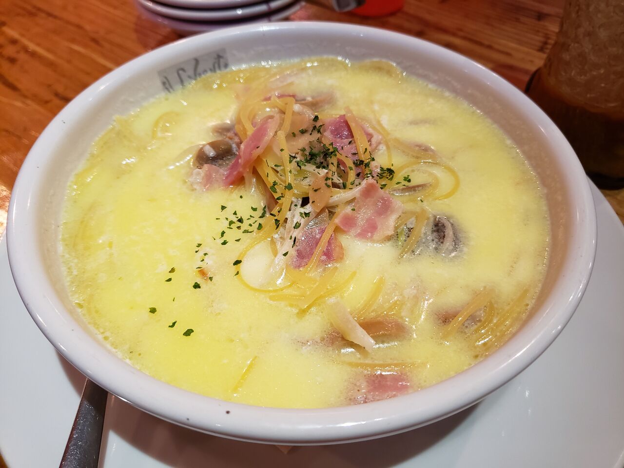 カルボナーラを薄くしてスープにしたような感じなんだけどこれが美味しい!