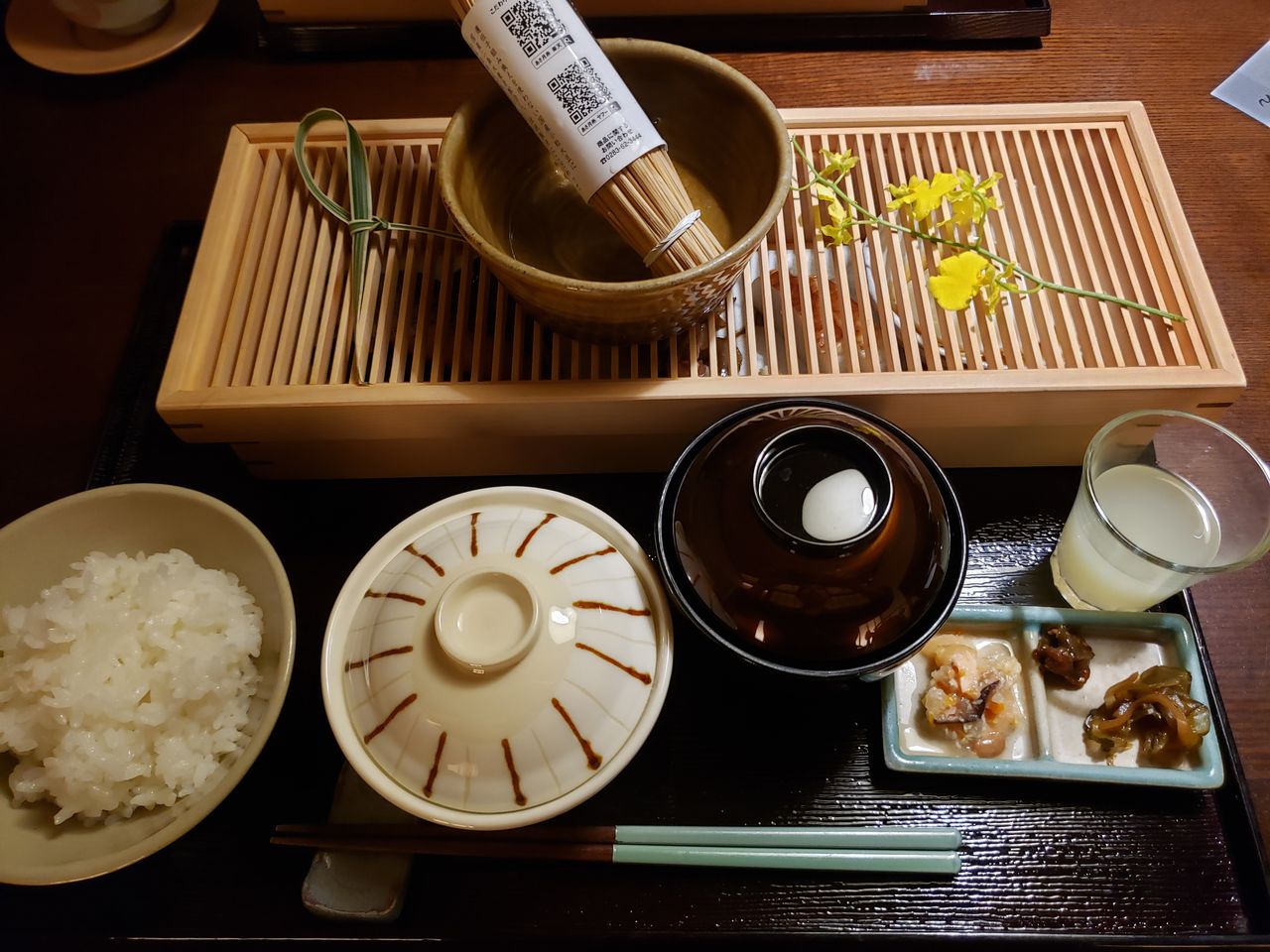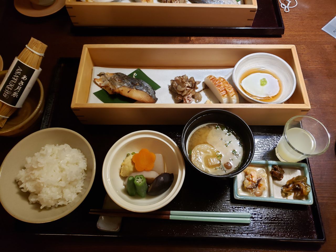 ご当地ジュース、お味噌汁に白飯に藁苞に入った納豆!
