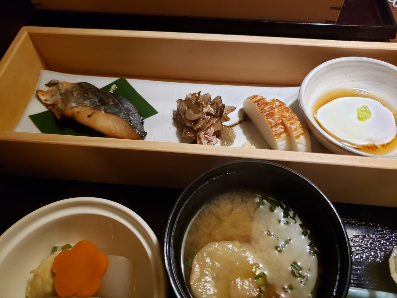 鰆味醂漬け、鶏ごぼう、焼きかまぼこ、温泉卵。