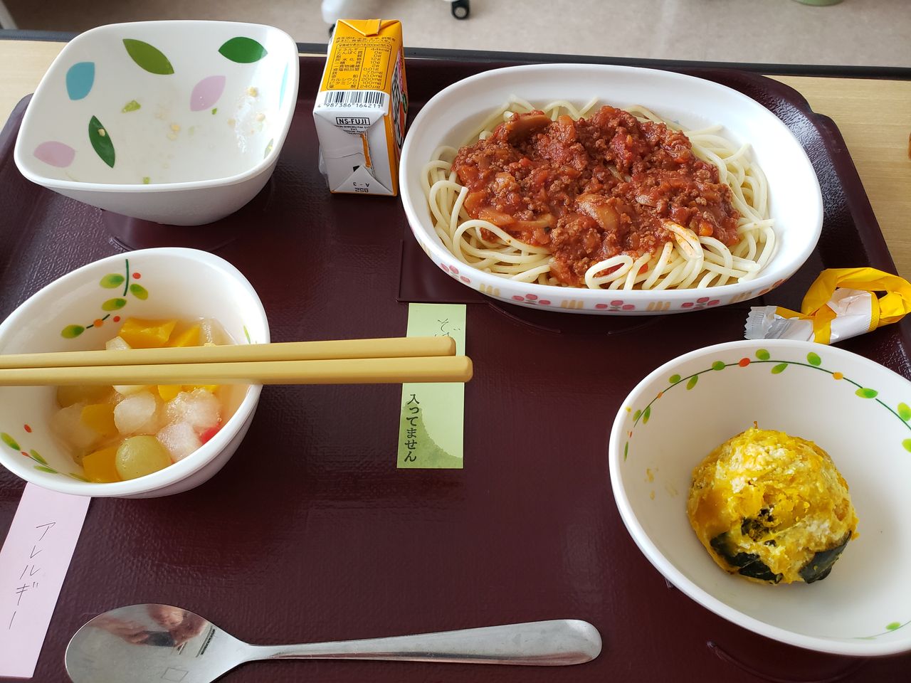 メニューはミートスパゲティ、グリーンサラダ、かぼちゃサラダ、ミックスフルーツ、オレンジジュース。