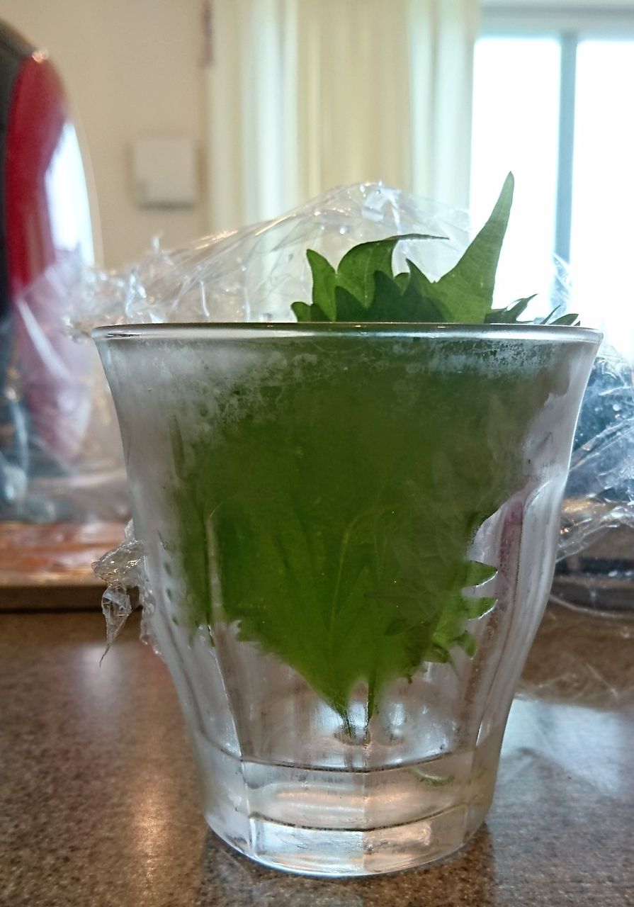 紫蘇挿して、ふんわりラップして冷蔵庫に入れると