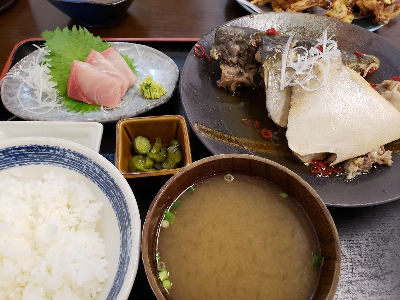 私は鰤のカマ煮定食で鰤刺し付き。(刺身かかき揚げか選べる)