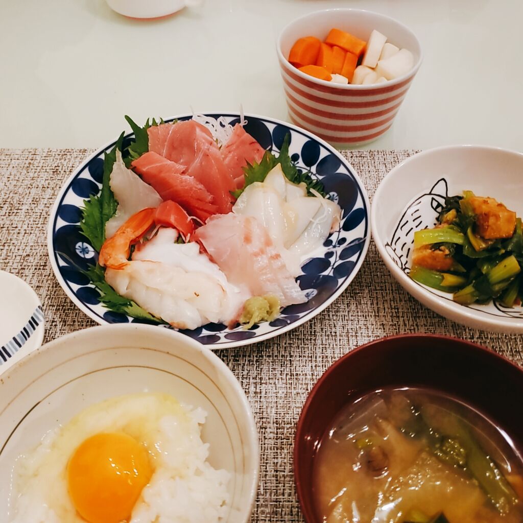 お刺身モリモリと小松菜の煮びたしと糠漬け。