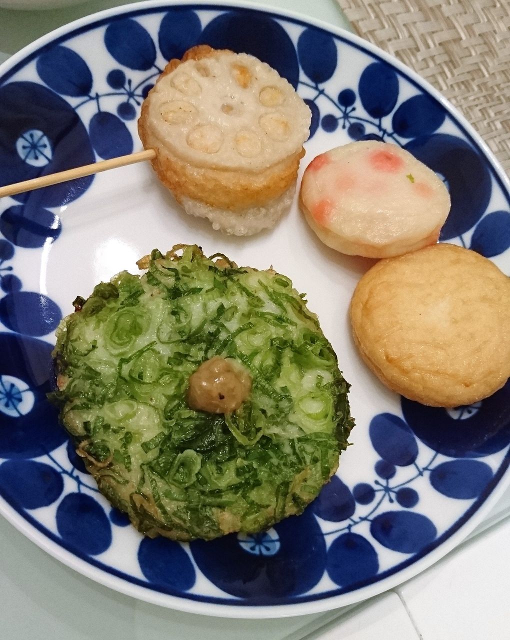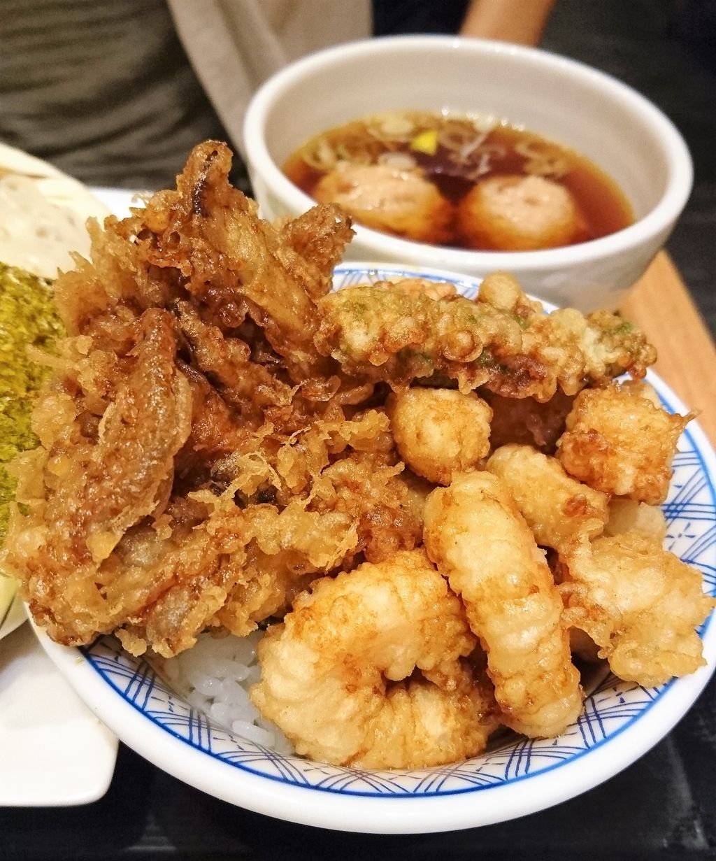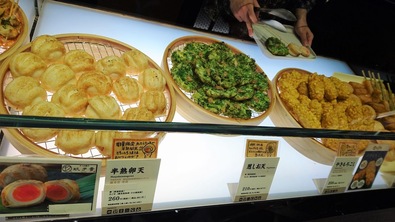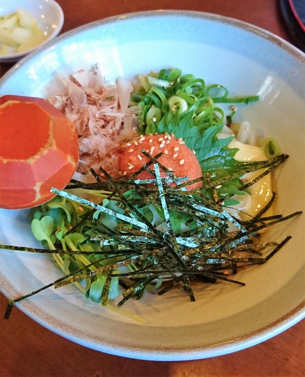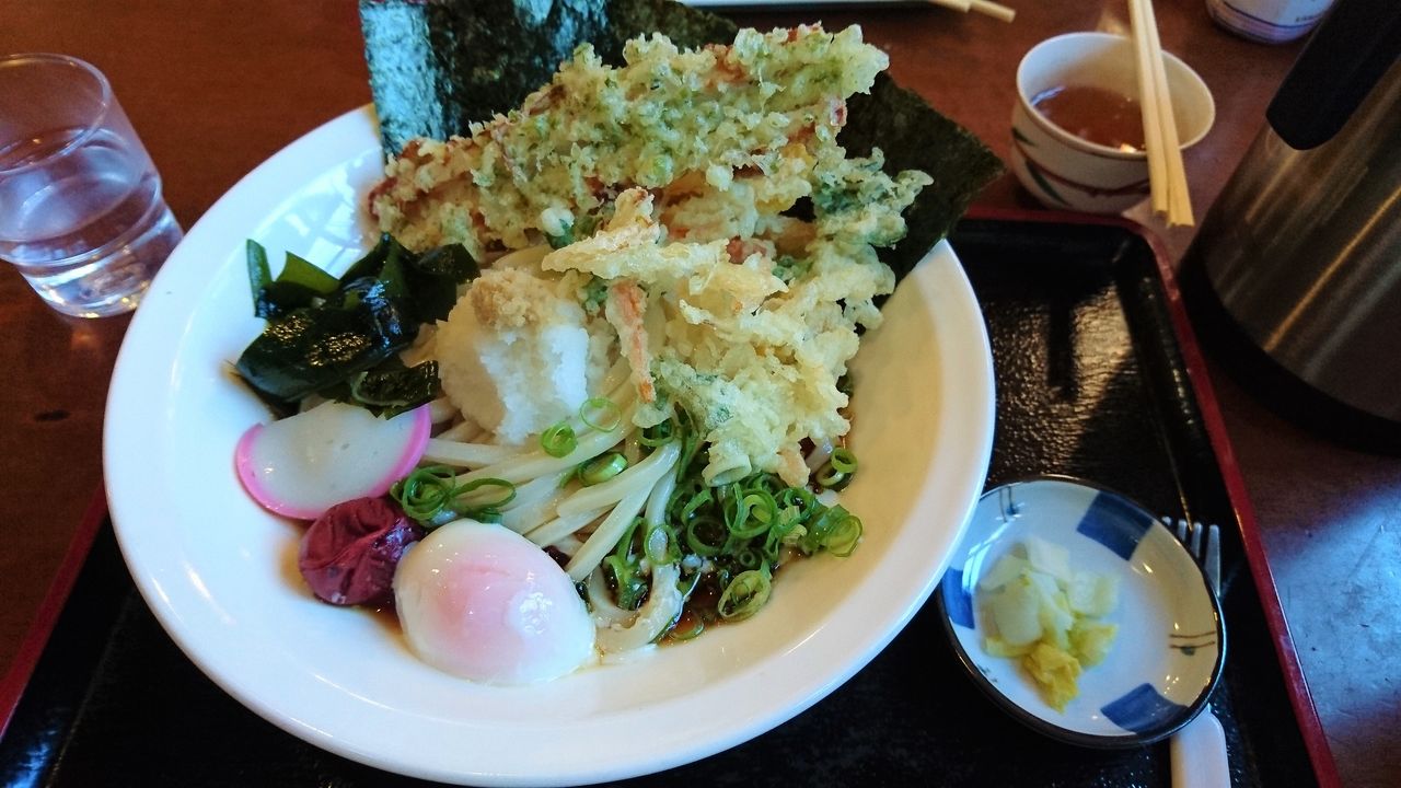 温泉卵、とろろ、かぼちゃ天、かりかりごぼうが入ったつけ汁に