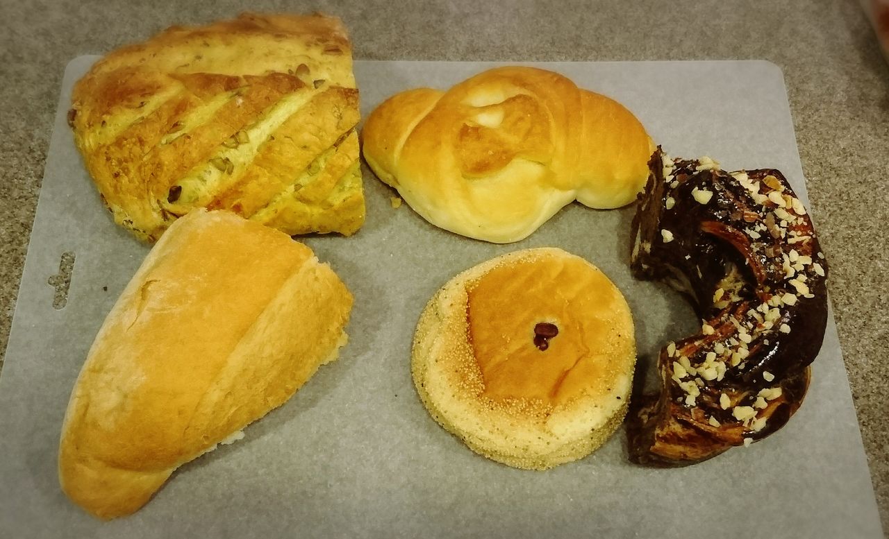 リッチなレーズンパン、たまごパン、唐揚げパン、チーズパン。