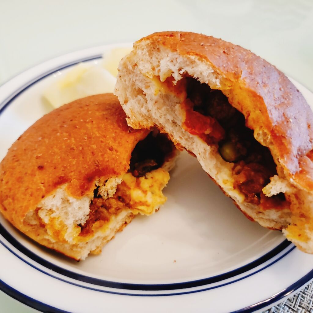 スクランブルエッグとチーズを挟んでいただきマース。
