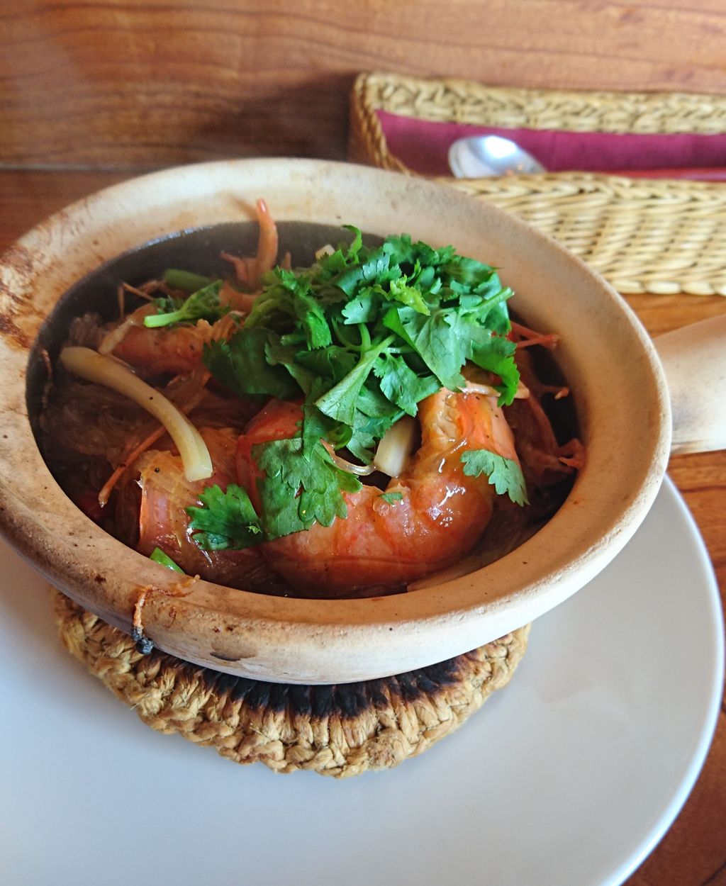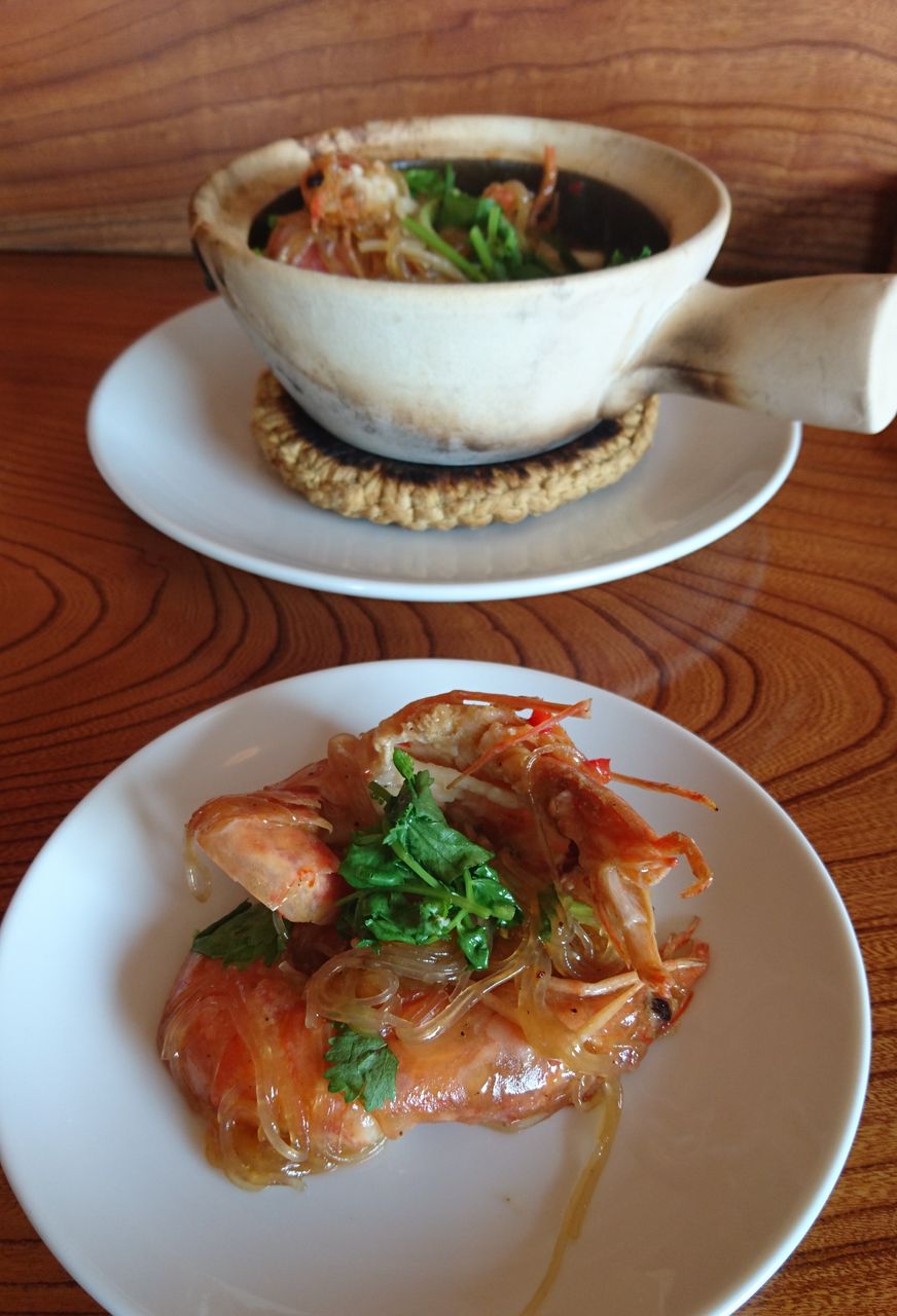 土鍋っぽいお皿にわんこもりのエビと春雨。