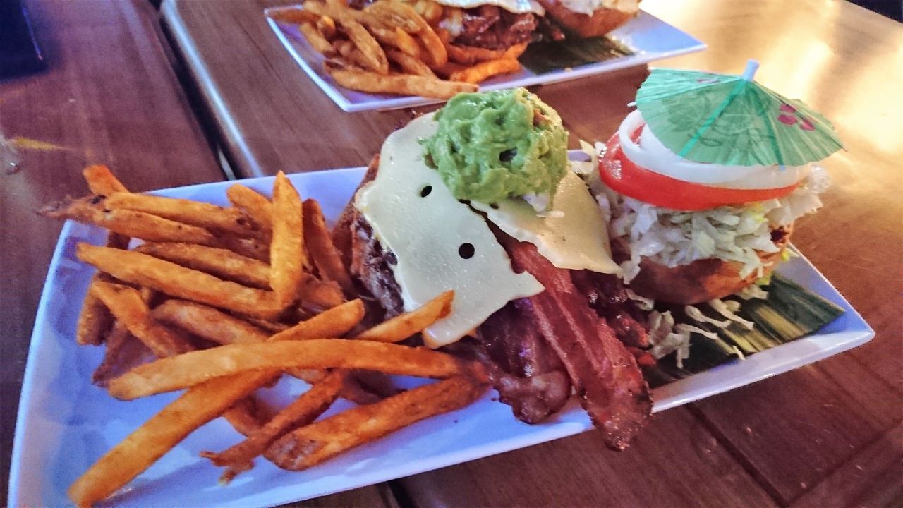 アボカドとチーズとベーコン、オニオンにトマトが乗っているがっつりハンバーガー。