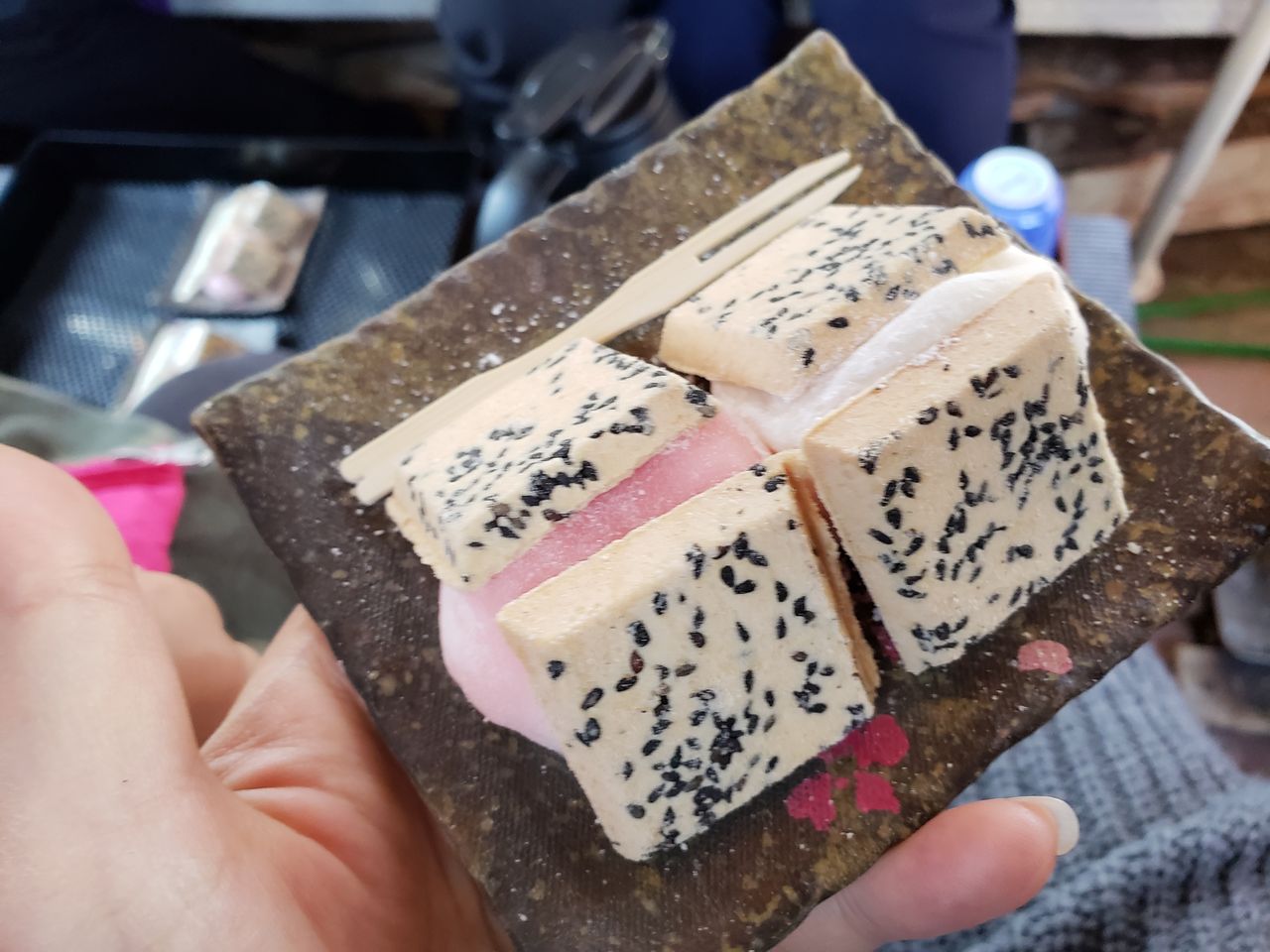ソフトクリームとか団子とか蒟蒻田楽とか売ってたので
