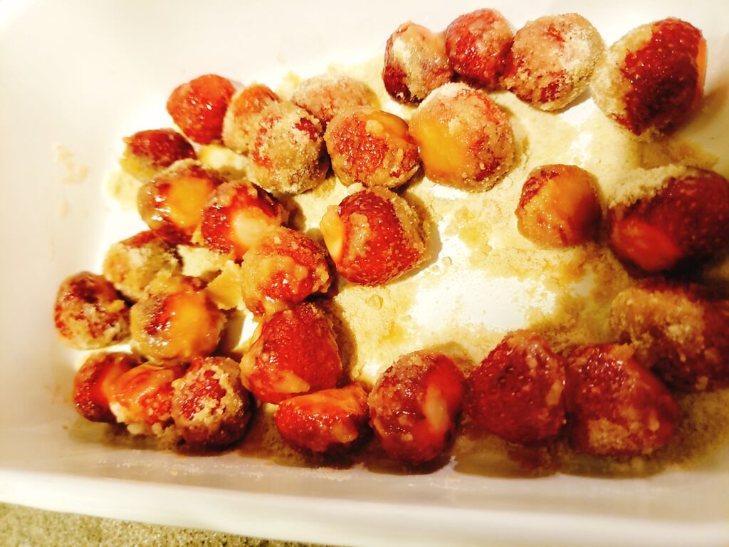イチゴの半量の砂糖をまぶしまーす。