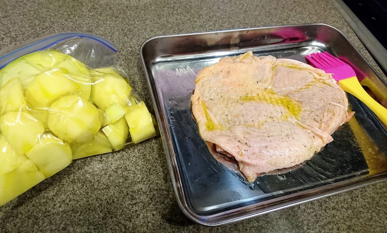 鶏もも肉にオリーブオイルを刷毛で塗って塩コショウを強めにしたもの&