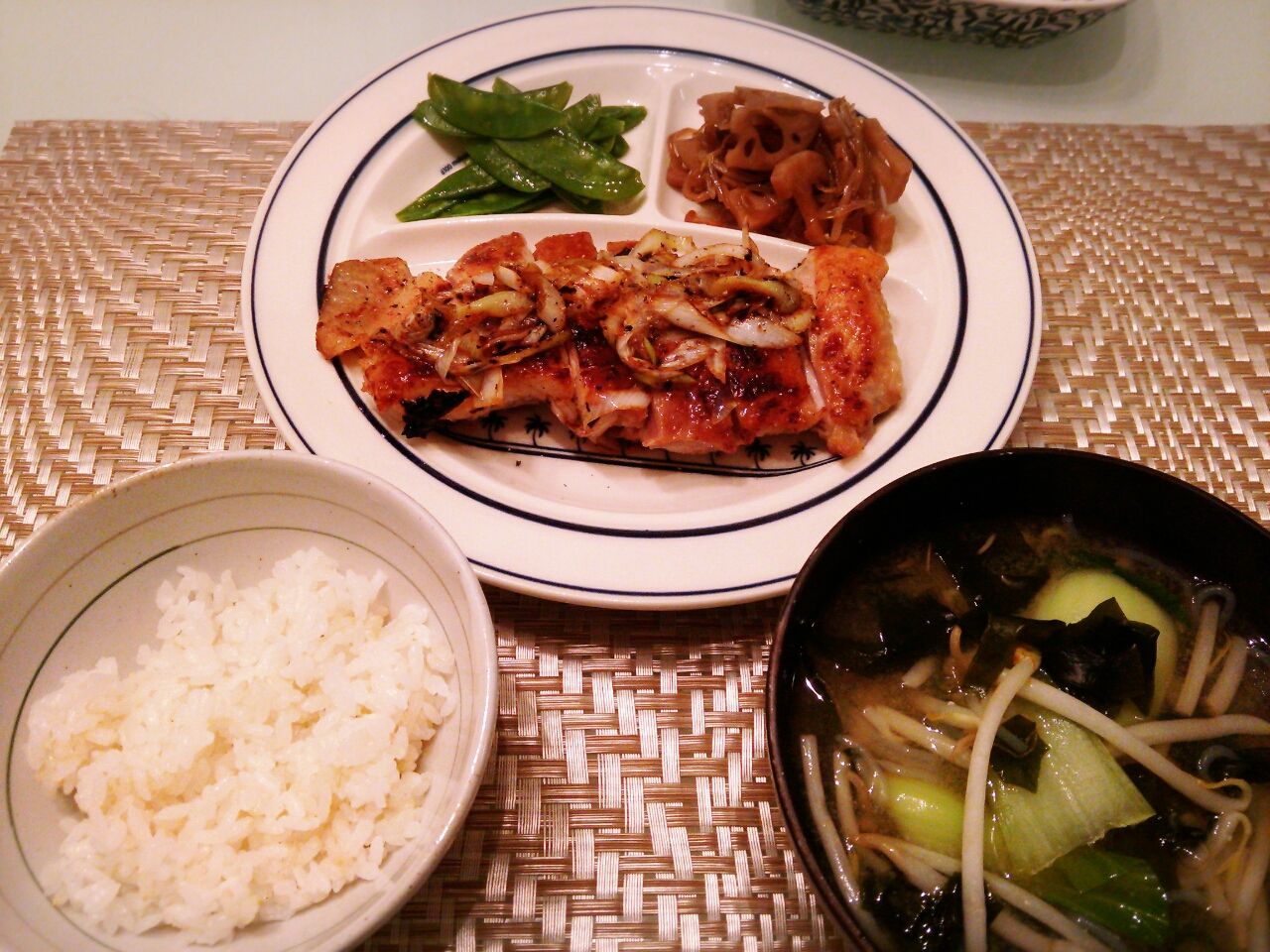 肉汁と塩麹が残ったフライパンでネギを炒めて肉の上に乗せ、胡椒を振っただけー!