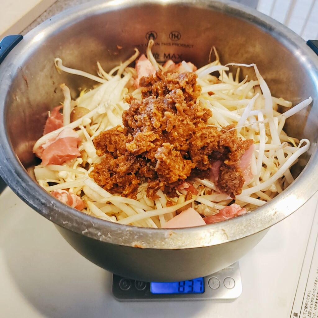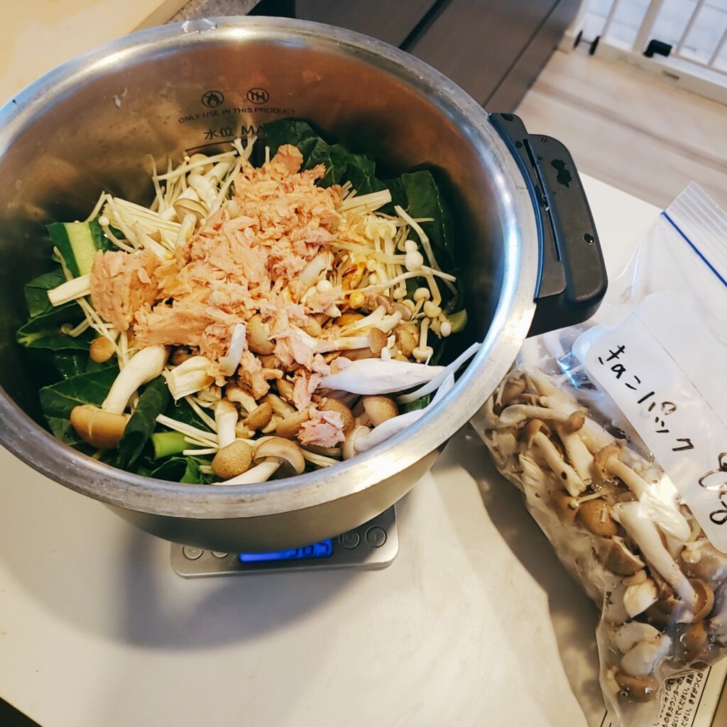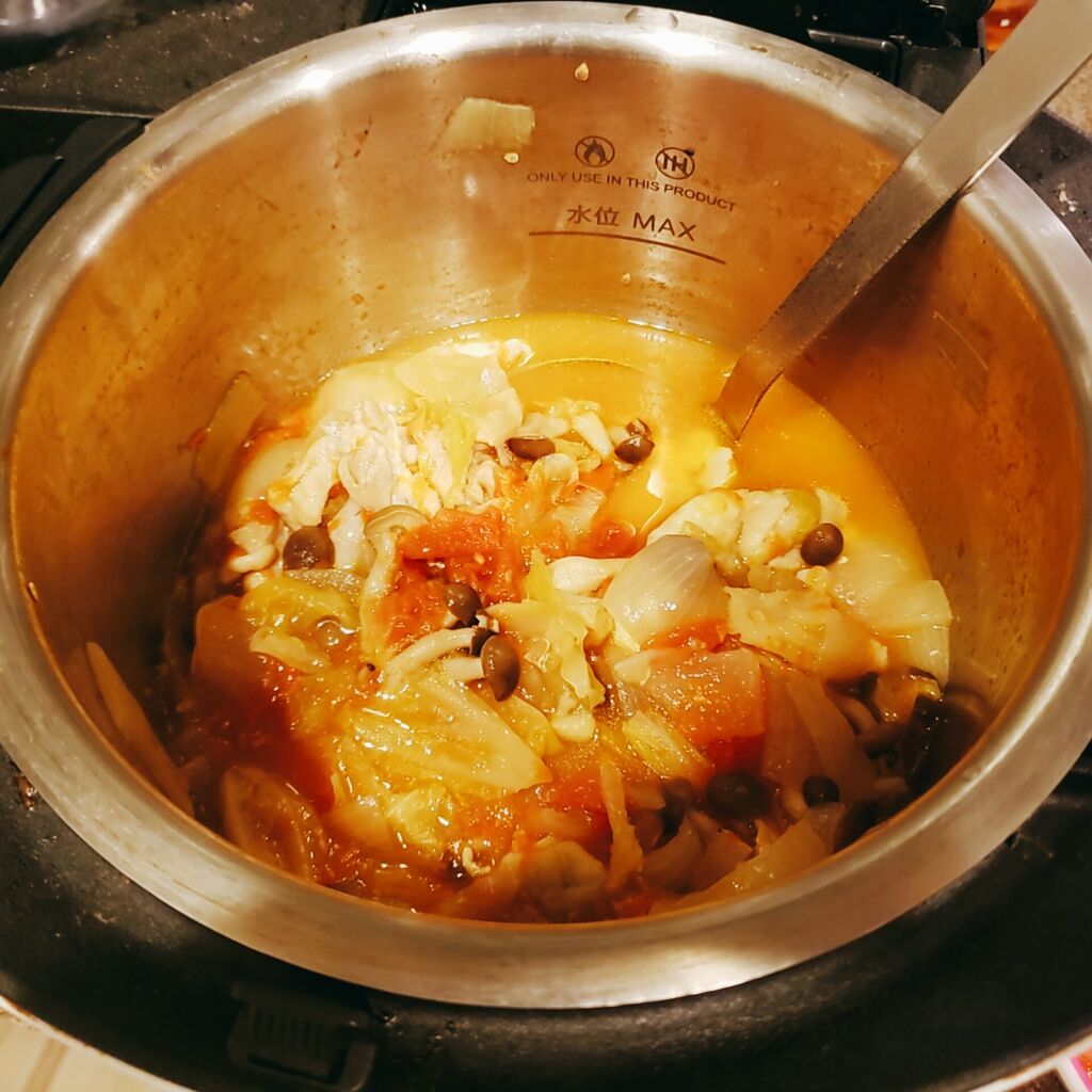 他には野菜室に入ってたえのきとかキャベツとかコンニャクとか適当にぶっこんだよ。