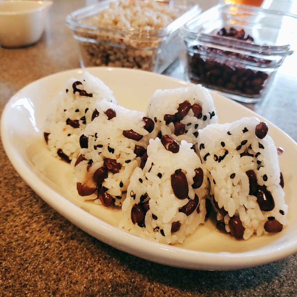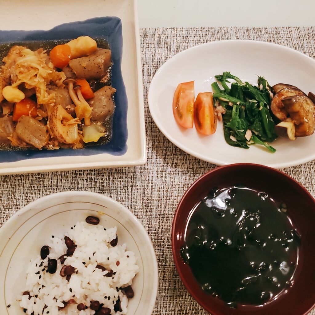 小豆と黒ゴマ入りごはんに筑前煮にナスのマリネと無限ほうれん草。