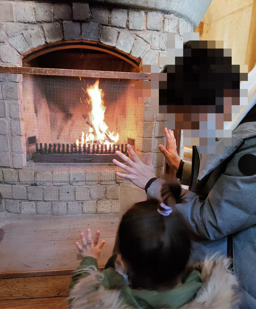 オドオドしながらパパの真似をして暖炉に手を当てて暖まっていました笑