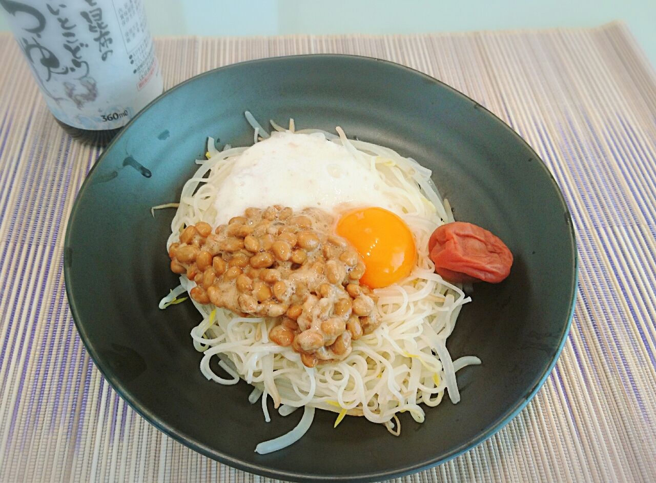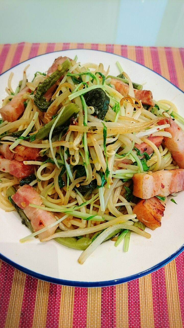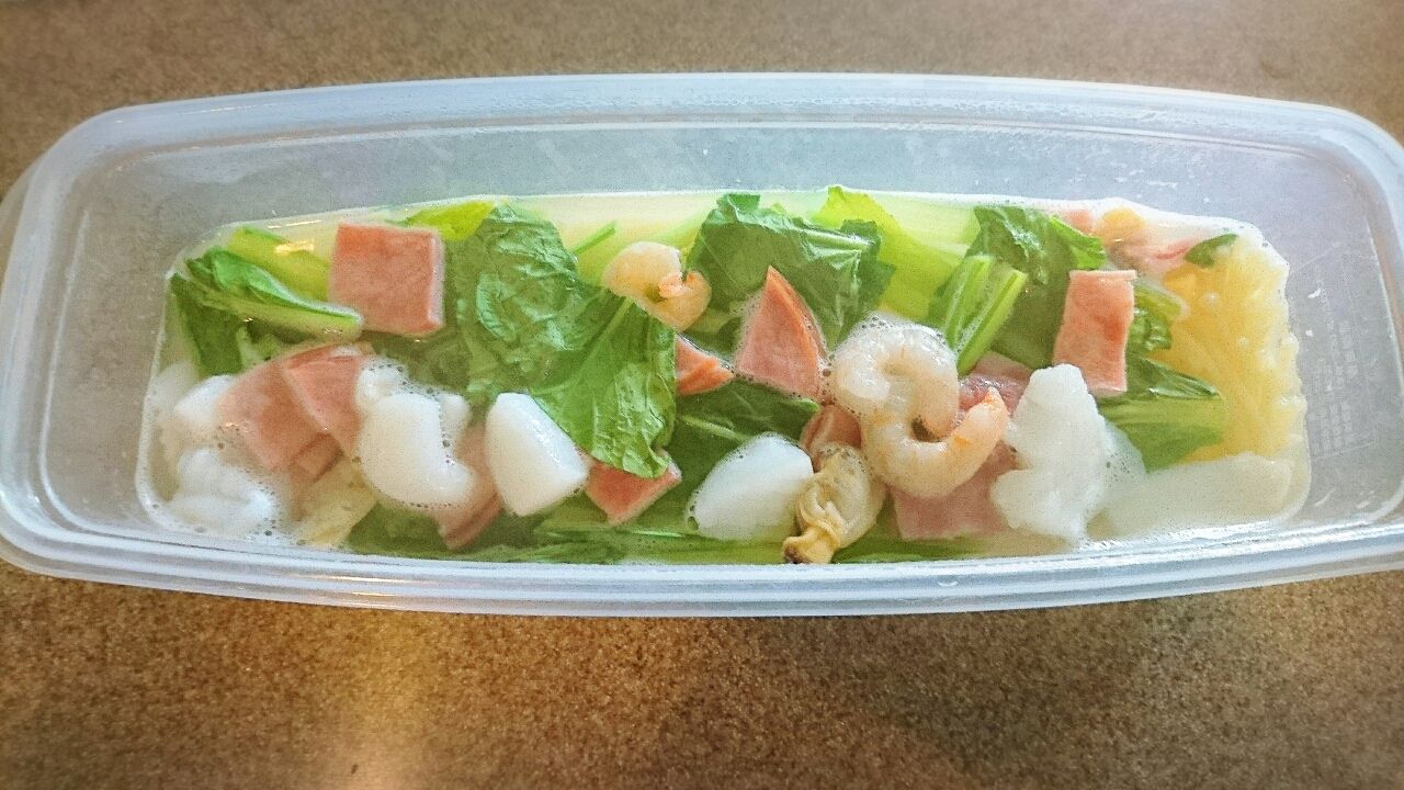 茹であがる4分前に冷蔵庫に余ってた小松菜とハムと冷凍シーフードをぶっこみさらにチン。