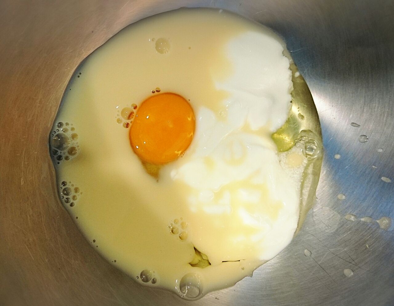 大方混ざったところで牛乳100ccを入れてダマが出来ないように混ぜ混ぜ。